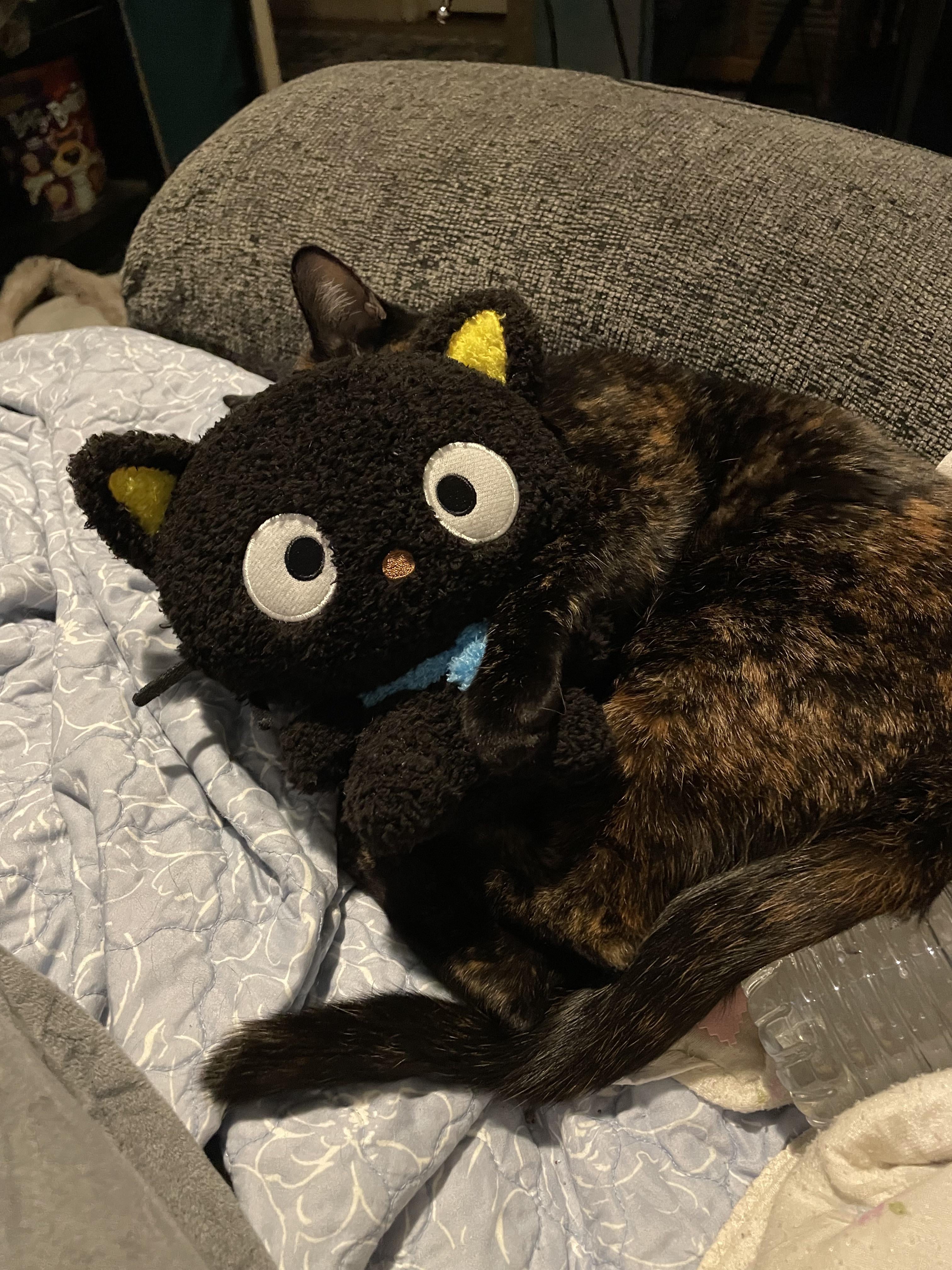 My tortie loves to cuddle with Chococate