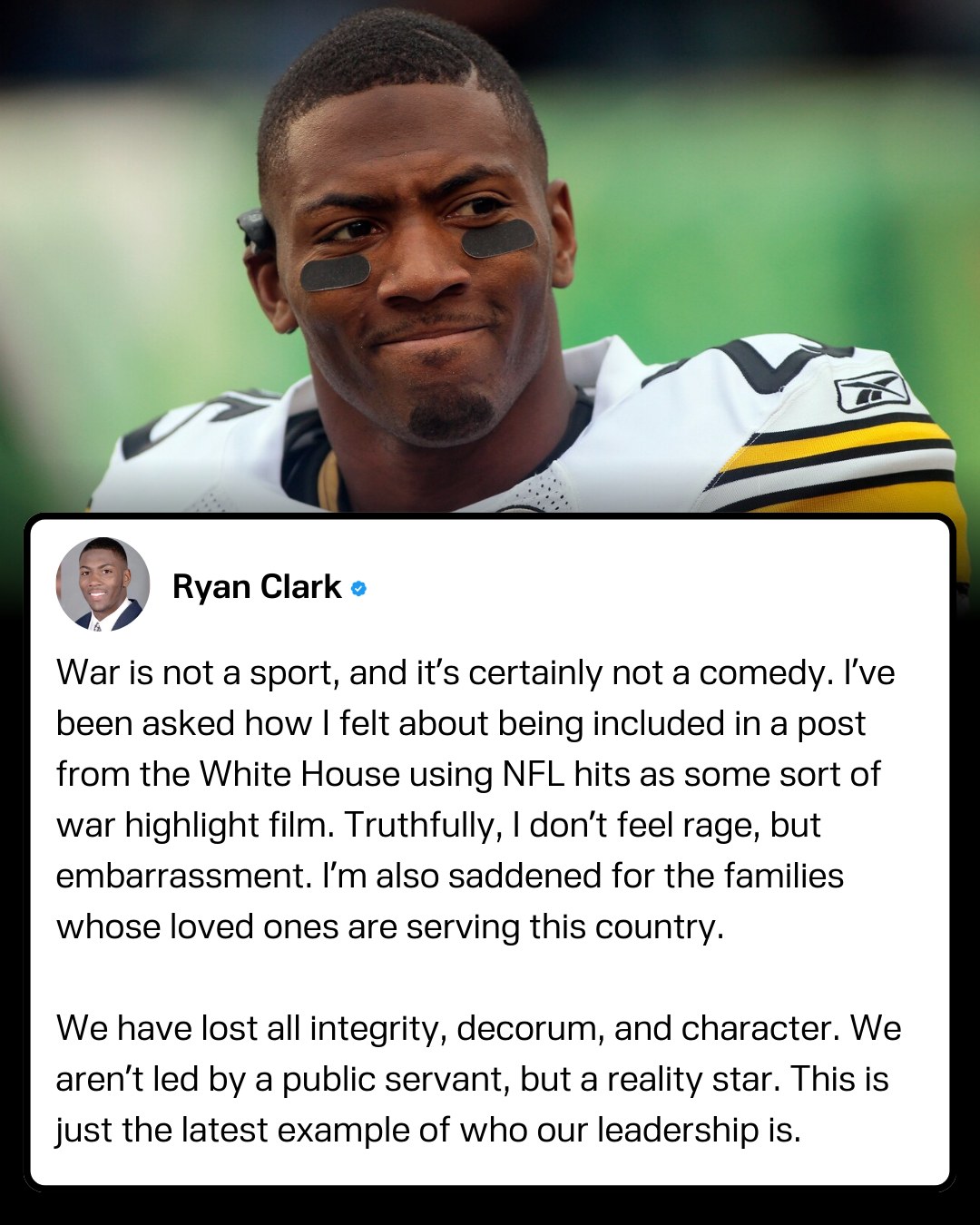 Clark added that “the White House post involving myself and other NFL players is absolutely disgusting and despicable.”Former NFL player Ryan Clark has slammed the White House after discovering he appeared in a controversial social media video that mixed football highlights with footage of bombing strikes from the ongoing war. The video, posted on X by the White House, edited together clips from NFL and college football games with real war footage and was captioned simply: “Touchdown.” Clark said he later realized he was among the athletes shown in the football clips and called the edit deeply disturbing. Speaking on his podcast, he criticized the use of sports and pop-culture references to frame real combat footage. “To have Tropic Thunder and football highlights in a video about war is one of the more insensitive things that I’ve ever seen,” Clark said. “There are families in this country whose loved ones have chosen to give their lives to fight for our rights and freedoms. They don’t see war as a sport.” Clark added that “the White House post involving myself and other NFL players is absolutely disgusting and despicable.”0 Comments 0 Shares 21 Views 0 Reviews