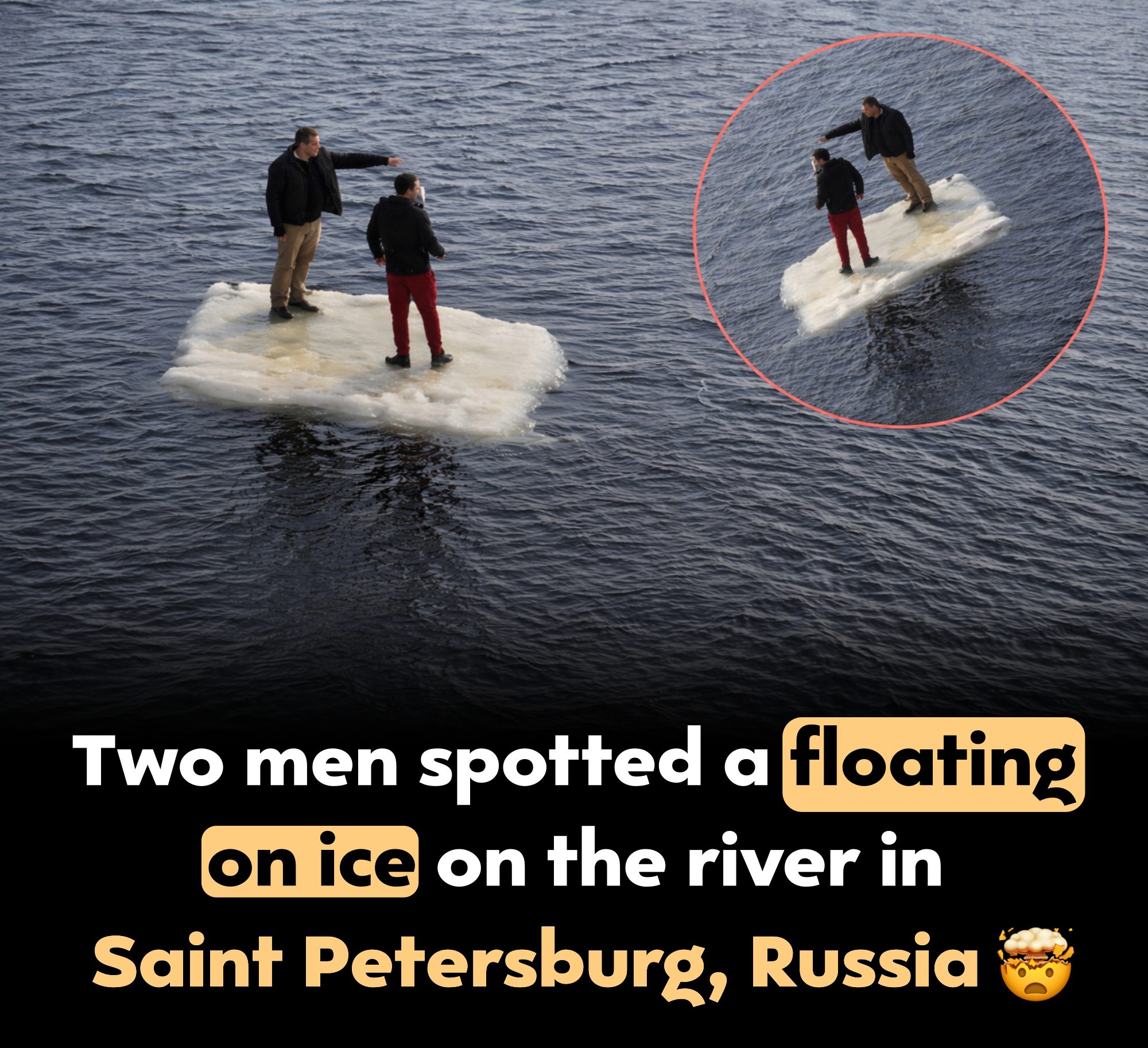 A surreal and risky scene unfolded in Saint Petersburg when two men were seen drifting down a river while standing on floating slabs of ice