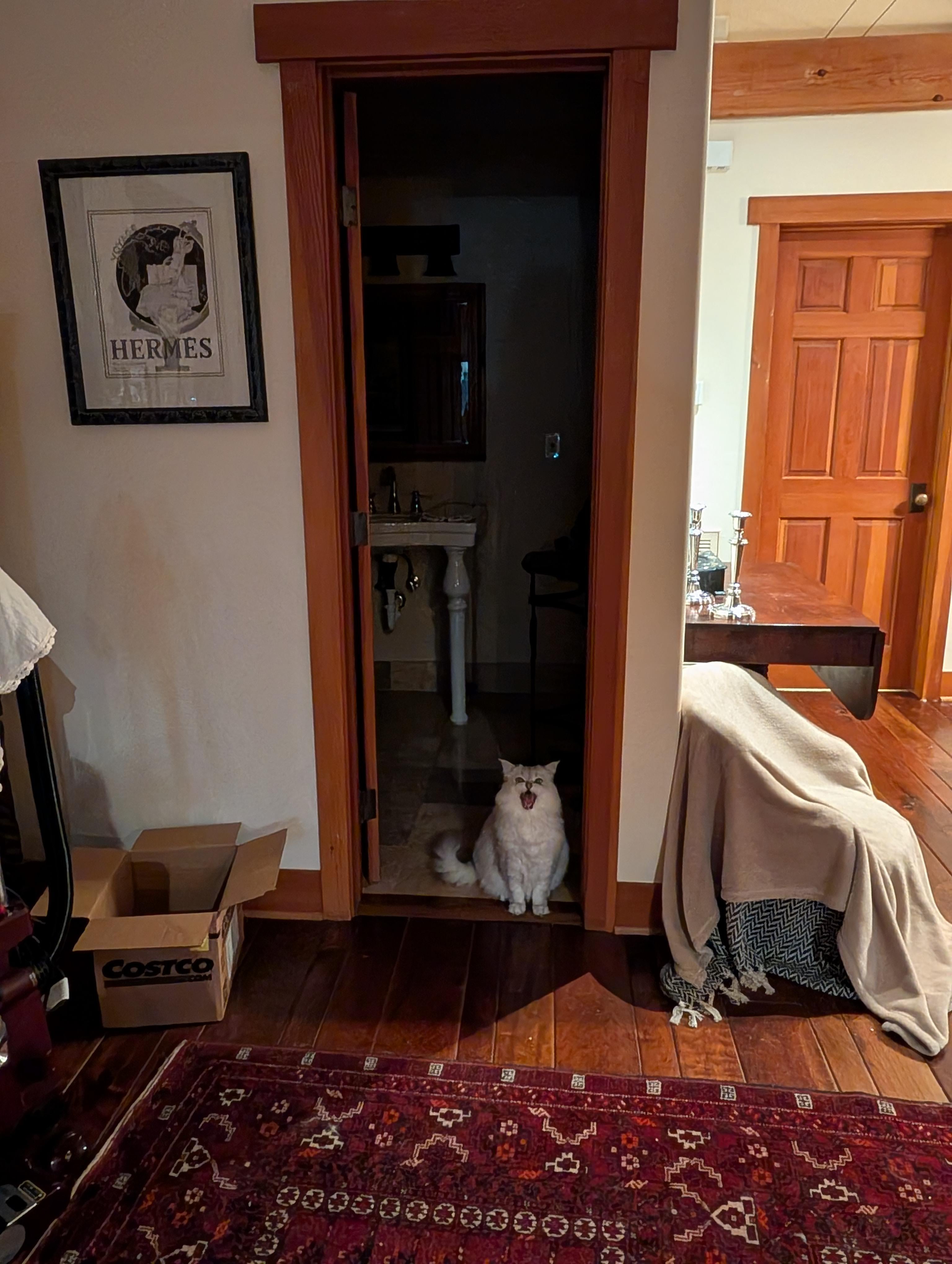 Dinner for one: Simon doesn't like eating with the other cats and prefers to eat in the guest bathroom by himself.
