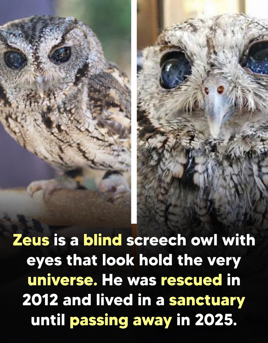 Though he never saw again, he adapted well and inspired thousands. Zeus passed away in 2025, but his cosmic gaze is still remembered.Zeus wasn’t just a screech owl—his eyes looked like a galaxy. Rescued in 2012, injured and blind, he couldn’t return to the wild but lived safely in a sanctuary. Damage to his eyes created a rare, starry pattern, making him unforgettable. Though he never saw again, he adapted well and inspired thousands. Zeus passed away in 2025, but his cosmic gaze is still remembered.0 Kommentare 0 Geteilt 49 Ansichten 0 Bewertungen