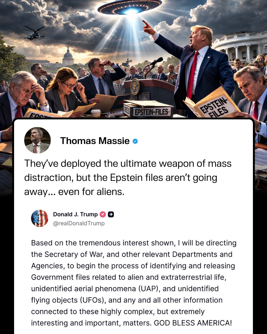 Rep. Thomas Massie says that Donald Trump releasing the classified information about aliens is the ultimate weapon of mass distraction from the Epstein files.Rep. Thomas Massie says that Donald Trump releasing the classified information about aliens is the ultimate weapon of mass distraction from the Epstein files.0 Comments 0 Shares 120 Views 0 Reviews