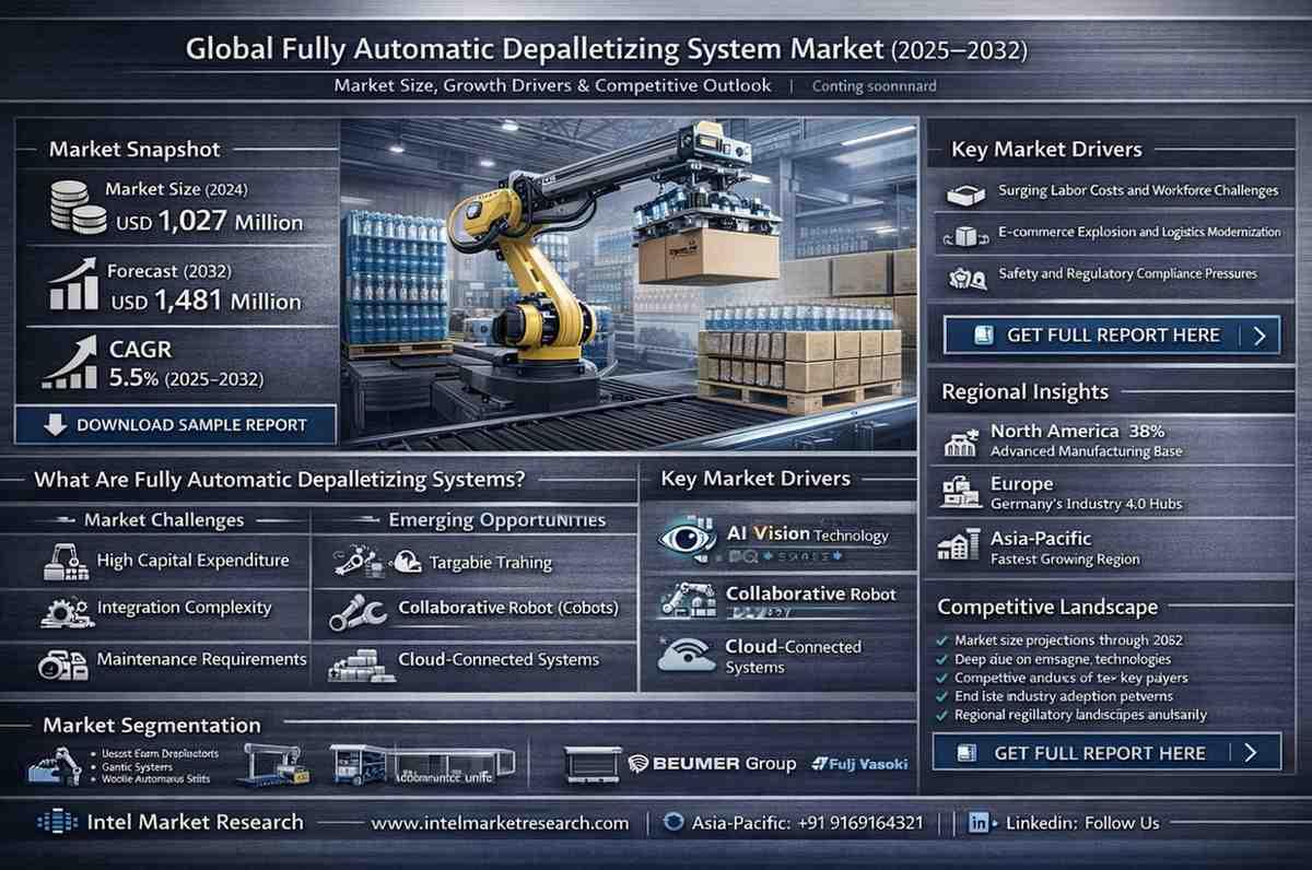 global fully automatic depalletizing system market was valued at USD 1,027 million in 2024 and is projected to reach USD 1,481 million by 2032, growing at a CAGR of 5.5% during the forecast period (2025-2032). This steady growth reflects the accelerating adoption of automation technologies across material handling operations in industries ranging from food processing to pharmaceuticals.global fully automatic depalletizing system market |CAGR of 5.5% global fully automatic depalletizing system market was valued at USD 1,027 million in 2024 and is projected to reach USD 1,481 million by 2032, growing at a CAGR of 5.5% during the forecast period (2025-2032). This steady growth reflects the accelerating adoption of automation technologies across material handling operations in industries ranging from food processing to pharmaceuticals.0 Comments ·0 Shares ·28 Views ·0 Reviews
