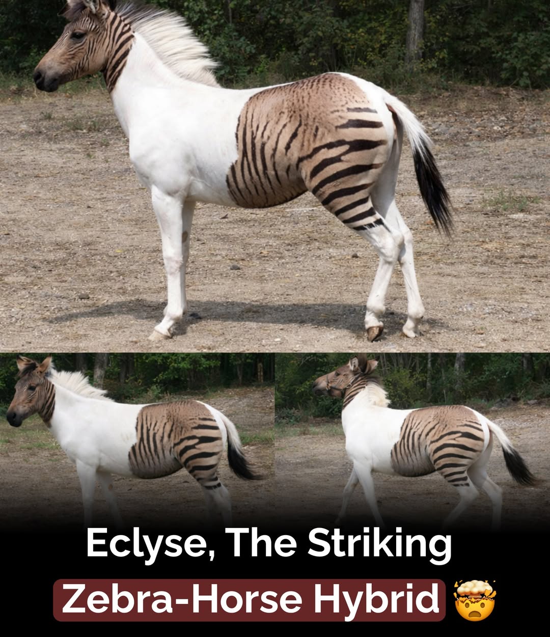 What makes Eclyse stand out is her stunning coat . Unlike most zorses that display evenly mixed traits, Eclyse’s body is mostly white with bold, dramatic black zebra stripes concentrated on her face and hindquarters. This unique pattern gives her a surreal, artistic look—like a living painting blending two worlds into one . Her name, inspired by the word “eclipse,” perfectly reflects this rare and beautiful fusion .