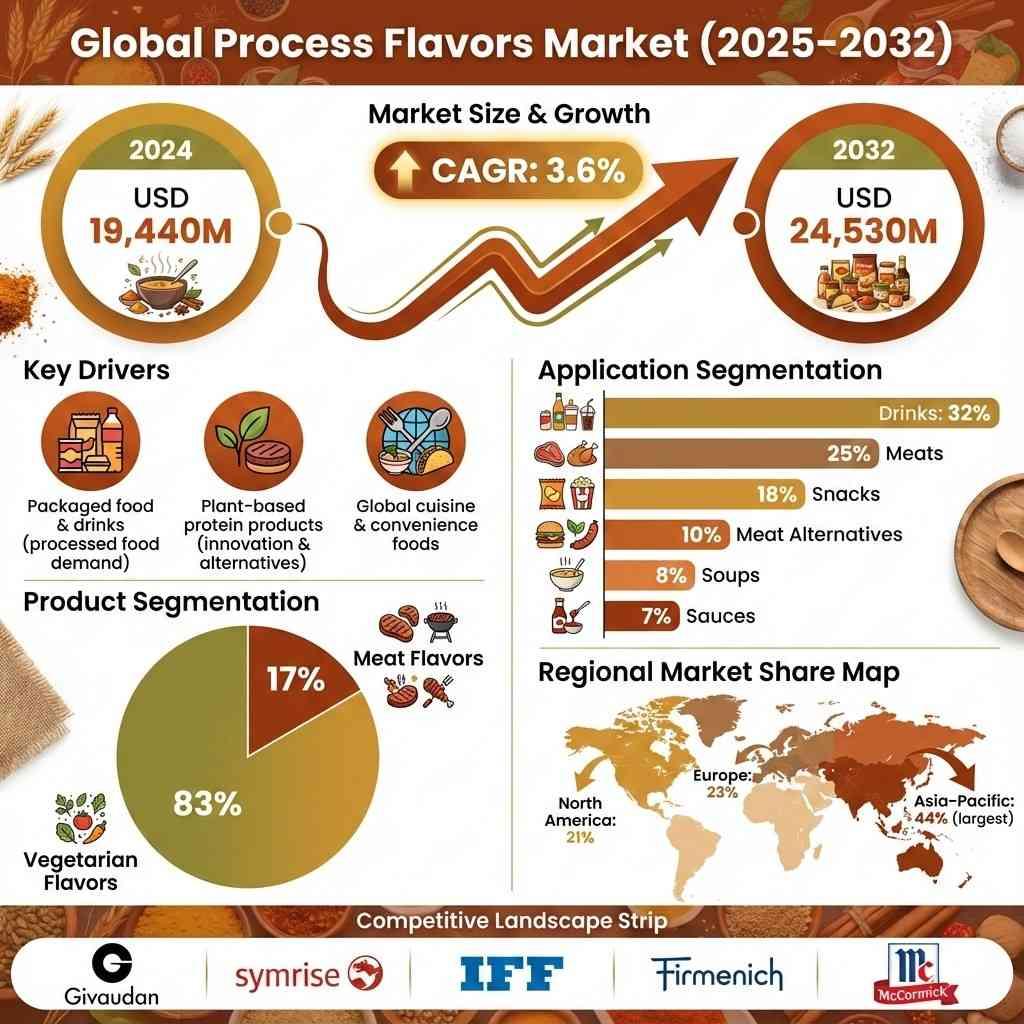 global Process Flavors market was valued at USD 19,440 million in 2024 and is expected to reach USD 24,530 million by 2032, growing at a CAGR of 3.6%. Growth is driven by increasing demand for processed and convenience foods, rising consumer expectations for authentic flavors, and innovation in plant-based and alternative protein products, with Asia-Pacific leading the market at 44% share.Global Process Flavors Market (2025–2032): Projected to Grow at 3.6% CAGR Driven by Processed Foods and Plant-Based Innovations global Process Flavors market was valued at USD 19,440 million in 2024 and is expected to reach USD 24,530 million by 2032, growing at a CAGR of 3.6%. Growth is driven by increasing demand for processed and convenience foods, rising consumer expectations for authentic flavors, and innovation in plant-based and alternative protein products, with Asia-Pacific leading the market at 44% share.0 Σχόλια ·0 Μοιράστηκε ·2 Views ·0 Προεπισκόπηση -