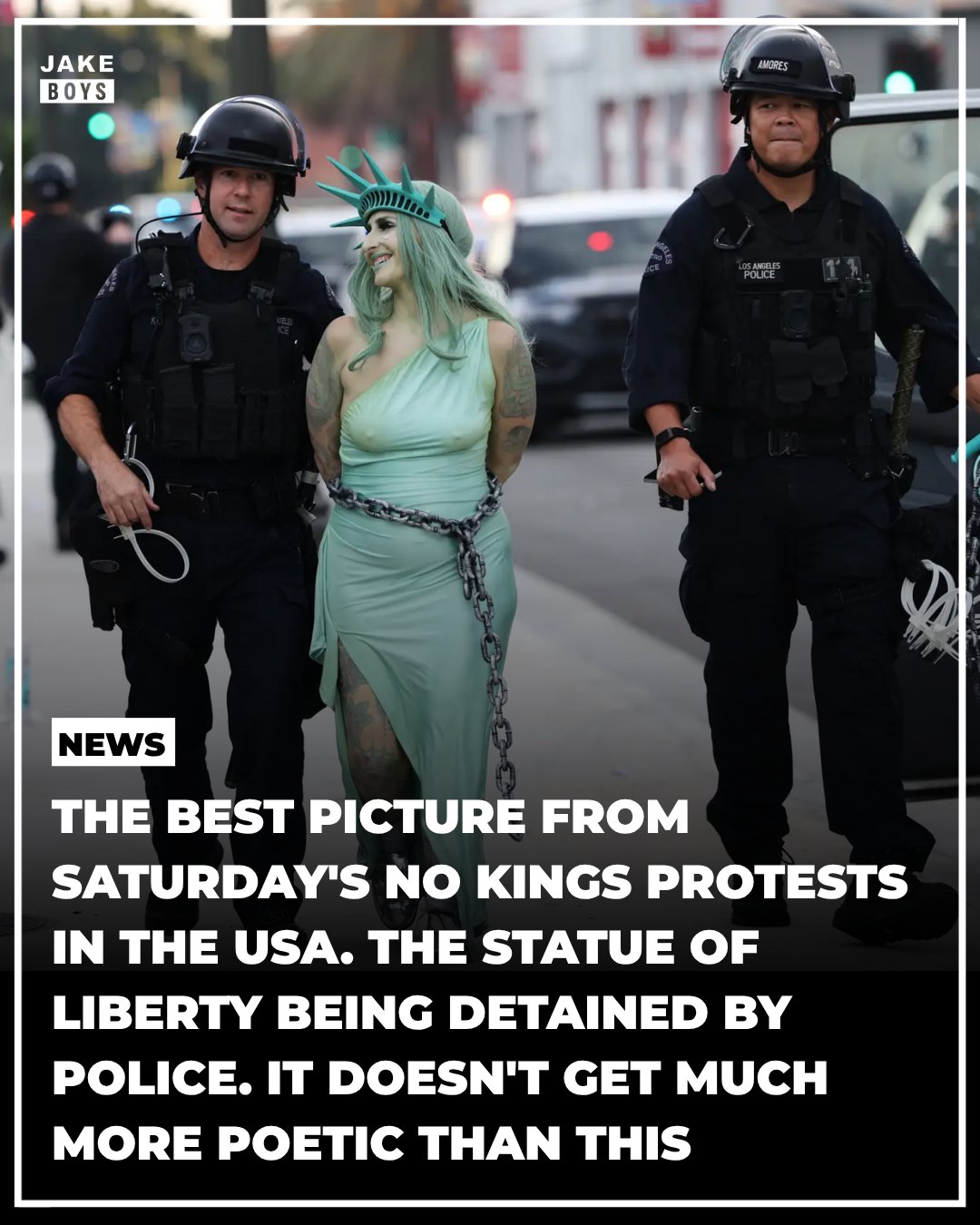 One of the most striking images from Saturday’s No Kings protests in the U.S. shows the Statue of Liberty being detained by police, a scene many are calling a powerful symbol of the nation’s current political tensions.