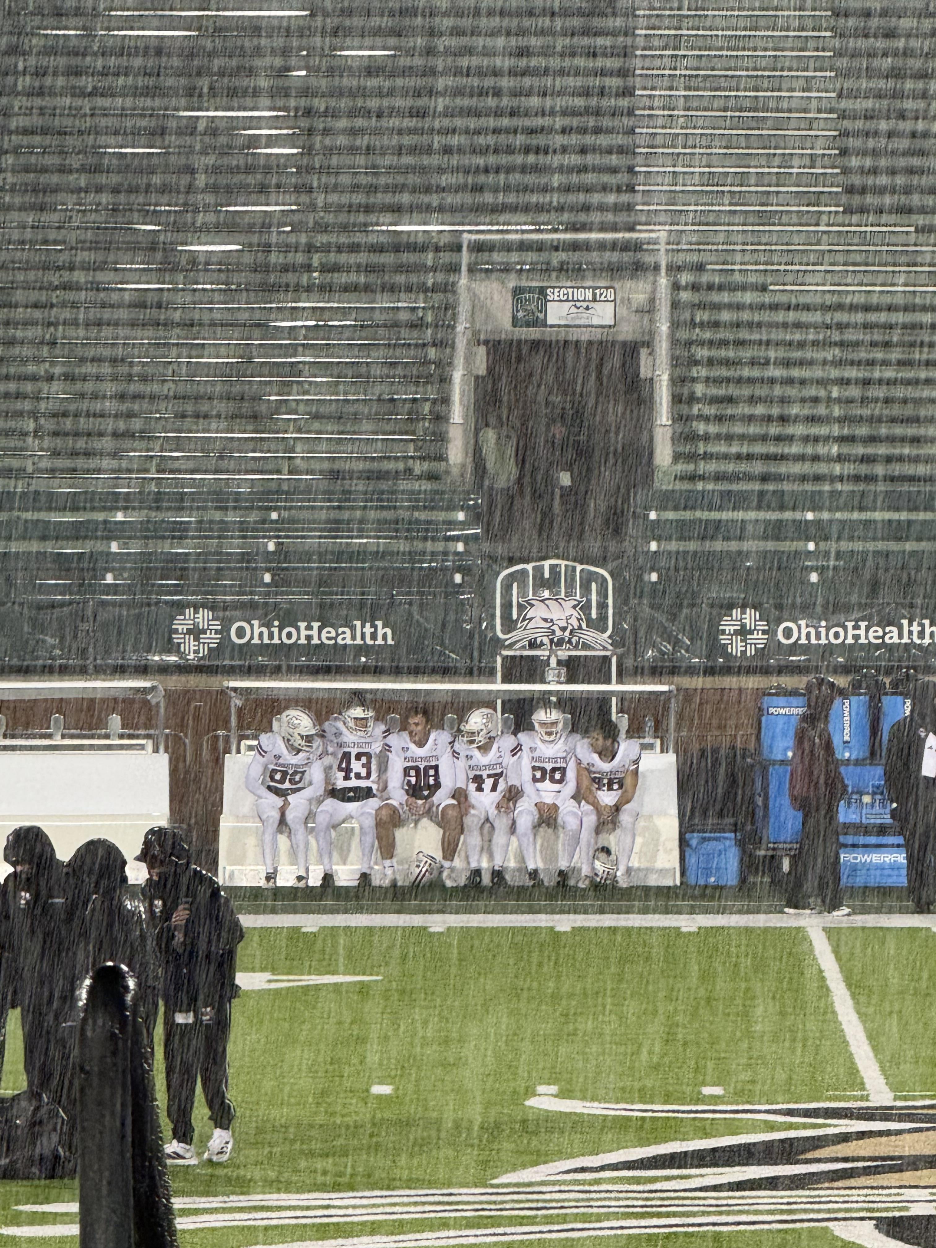 UMass football players hundled under a tent in Athens, Ohio [OC]