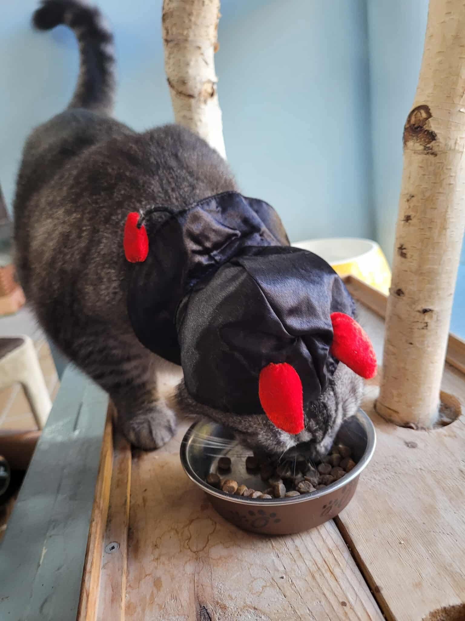 Bobby from our shelter with his Halloween costume. He doesn’t even want to look at us. But he’s always ready for food.