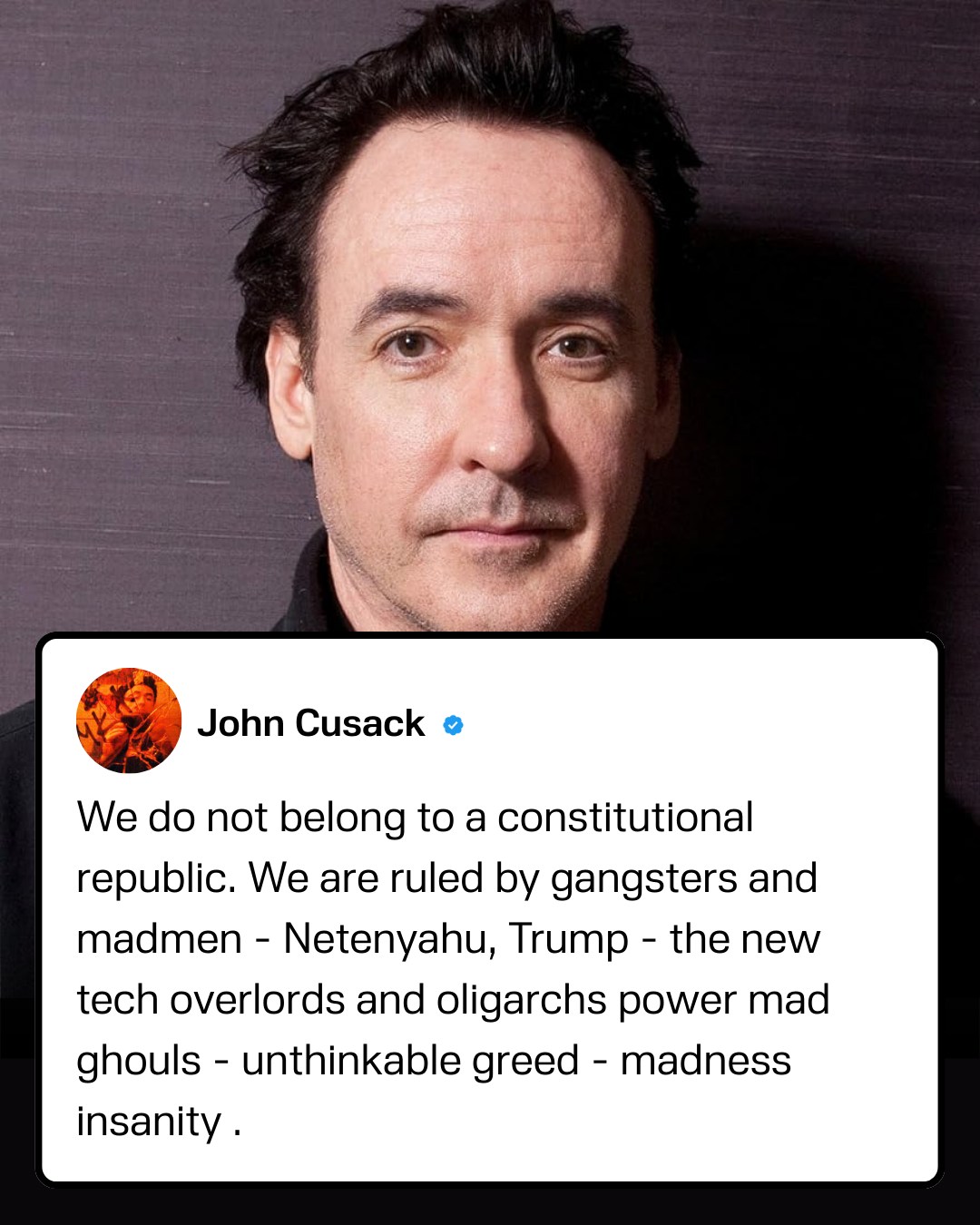 His controversial post claims America is no longer functioning as a democracy, but sliding into a cyberpunk-style oligarchy.Actor John Cusack has lashed out at Netenyahu & Trump after military intervention in Iran His controversial post claims America is no longer functioning as a democracy, but sliding into a cyberpunk-style oligarchy.0 Comments 0 Shares 40 Views 0 Reviews