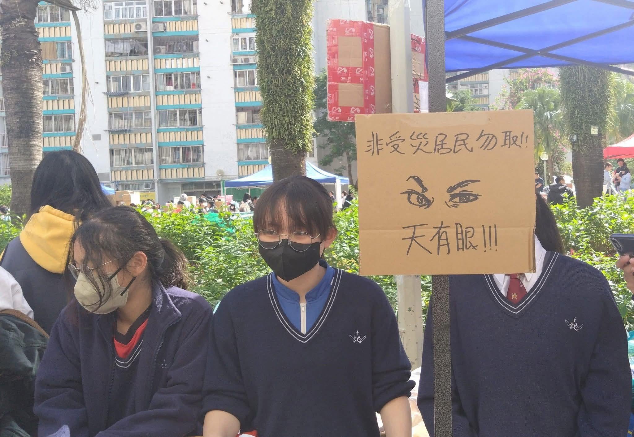 Students in Hong Kong setting up a watchpost to prevent supply thieves disguising as victims of the Tai Po fire
