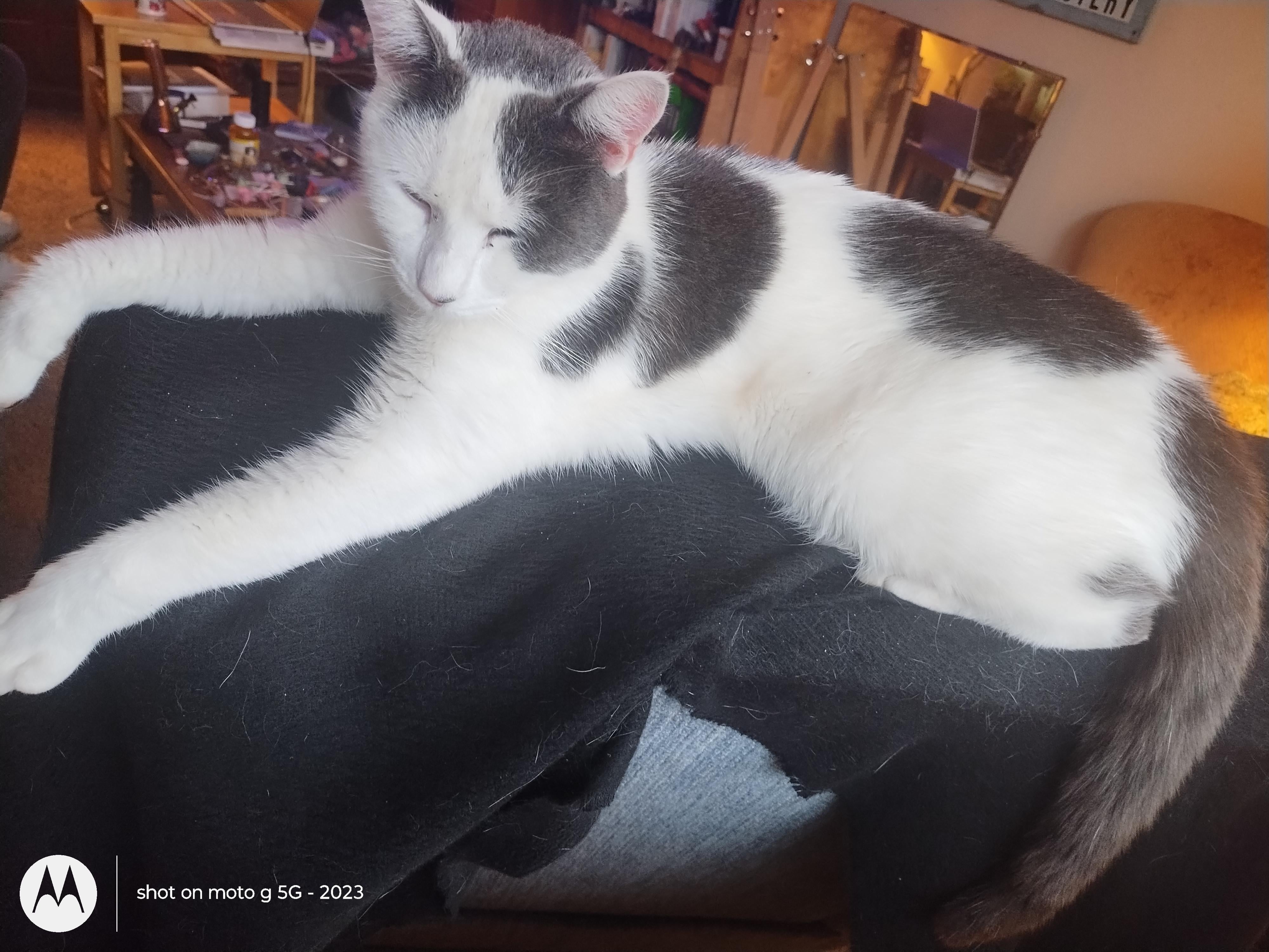 Dipstick likes to sleep on the back of my recliner