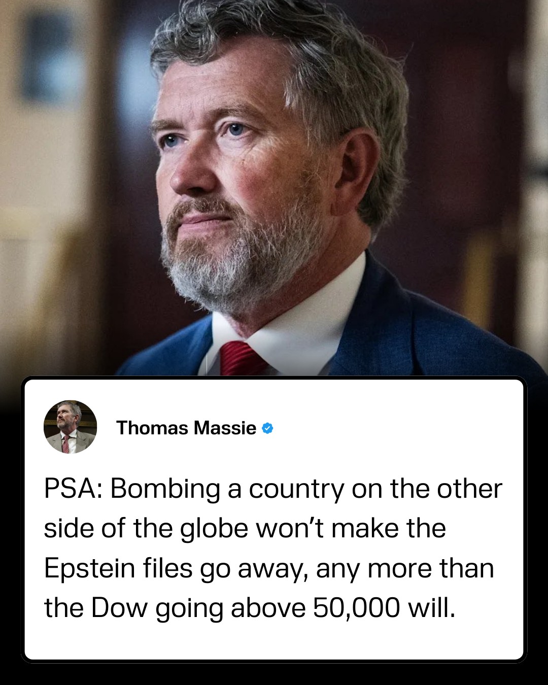 Rep. Thomas Massie has taken a swipe at President Donald Trump, stating that going into war with Iran will not make the Epstein files go away, implying that the operation is a distraction from the Epstein scandal.Rep. Thomas Massie has taken a swipe at President Donald Trump, stating that going into war with Iran will not make the Epstein files go away, implying that the operation is a distraction from the Epstein scandal.0 Comments 0 Shares 34 Views 0 Reviews