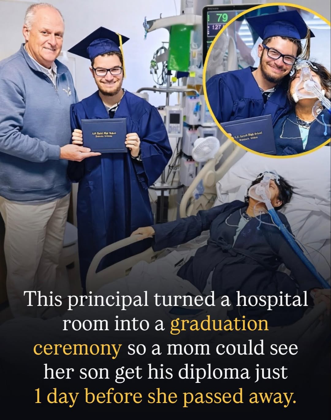 And sometimes… that one moment is enough.In 2023, Caleb Woodrum, a senior at Blanchard High School in Oklahoma, was facing something no student should have to. His mother, Stacie Scyrkels, was in the hospital — critically ill, running out of time. But she had one wish. To see her son graduate. When staff at Integris Health Southwest Medical Center heard that, they didn’t wait. Within 24 hours… They turned a hospital room into a graduation ceremony. Decorations went up. Family gathered. And Caleb walked in — cap and gown on. Standing beside her bed, he received his diploma… while holding her hand. No stage. No crowd. But it was real. And it meant everything. The next day… she passed away. On her 57th birthday. Sometimes, life gives you just one moment. And sometimes… that one moment is enough.0 Comments 0 Shares 124 Views 0 Reviews