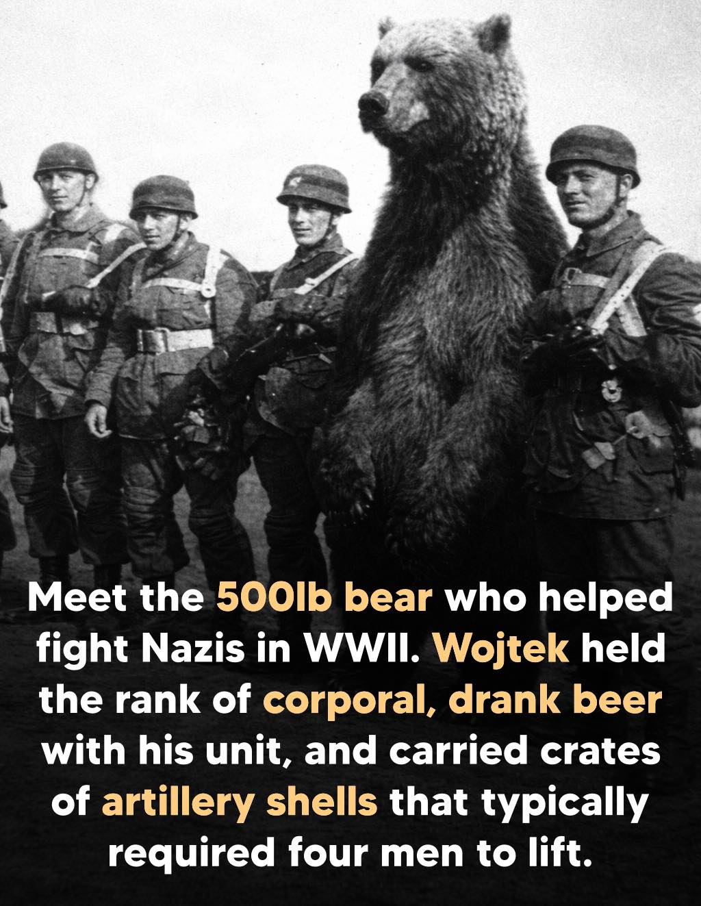 During World War II, the Polish army had an unusual soldier… a 500-pound bear named Wojtek.