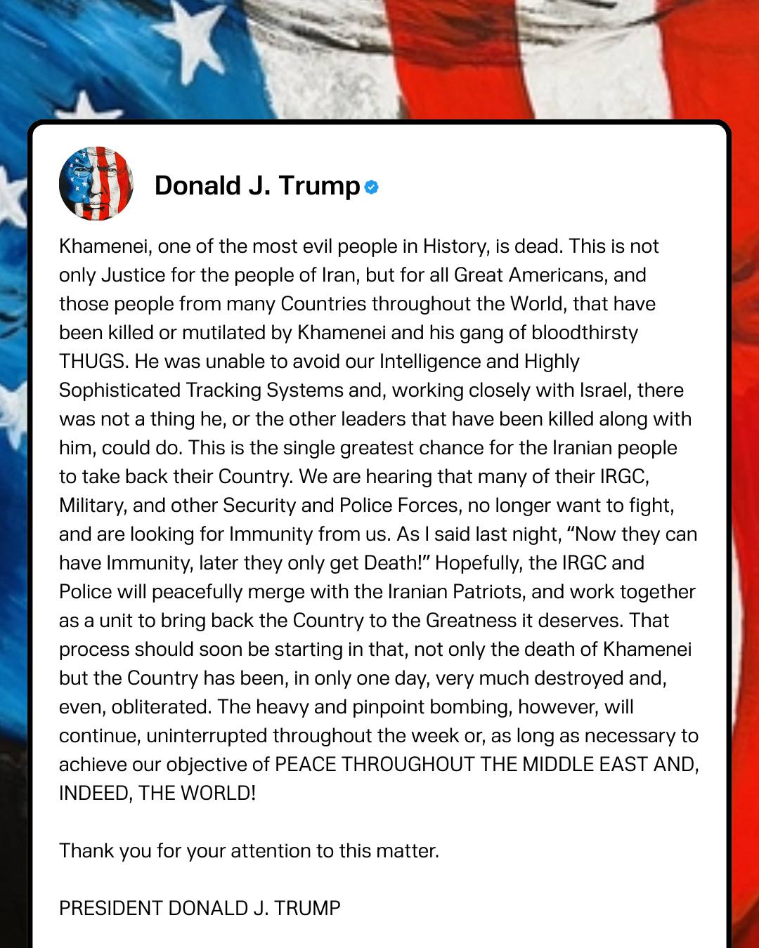 President Donald Trump says Iran's Supreme Leader Ali Khamenei is dead after the attacks on Iran during 'Operation Epic Fury.'President Donald Trump says Iran's Supreme Leader Ali Khamenei is dead after the attacks on Iran during 'Operation Epic Fury.'0 Comments 0 Shares 19 Views 0 Reviews