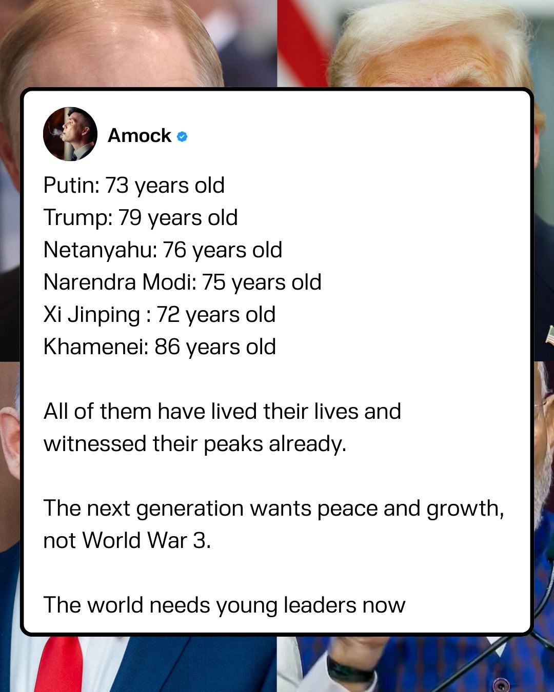 An X user says that current world leaders are too old and past their sell by date. Calls for young leaders to move the planet forward through peace and growth.An X user says that current world leaders are too old and past their sell by date. Calls for young leaders to move the planet forward through peace and growth.0 Comments 0 Shares 40 Views 0 Reviews
