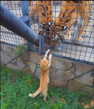 Two giant cats meeting a little cat