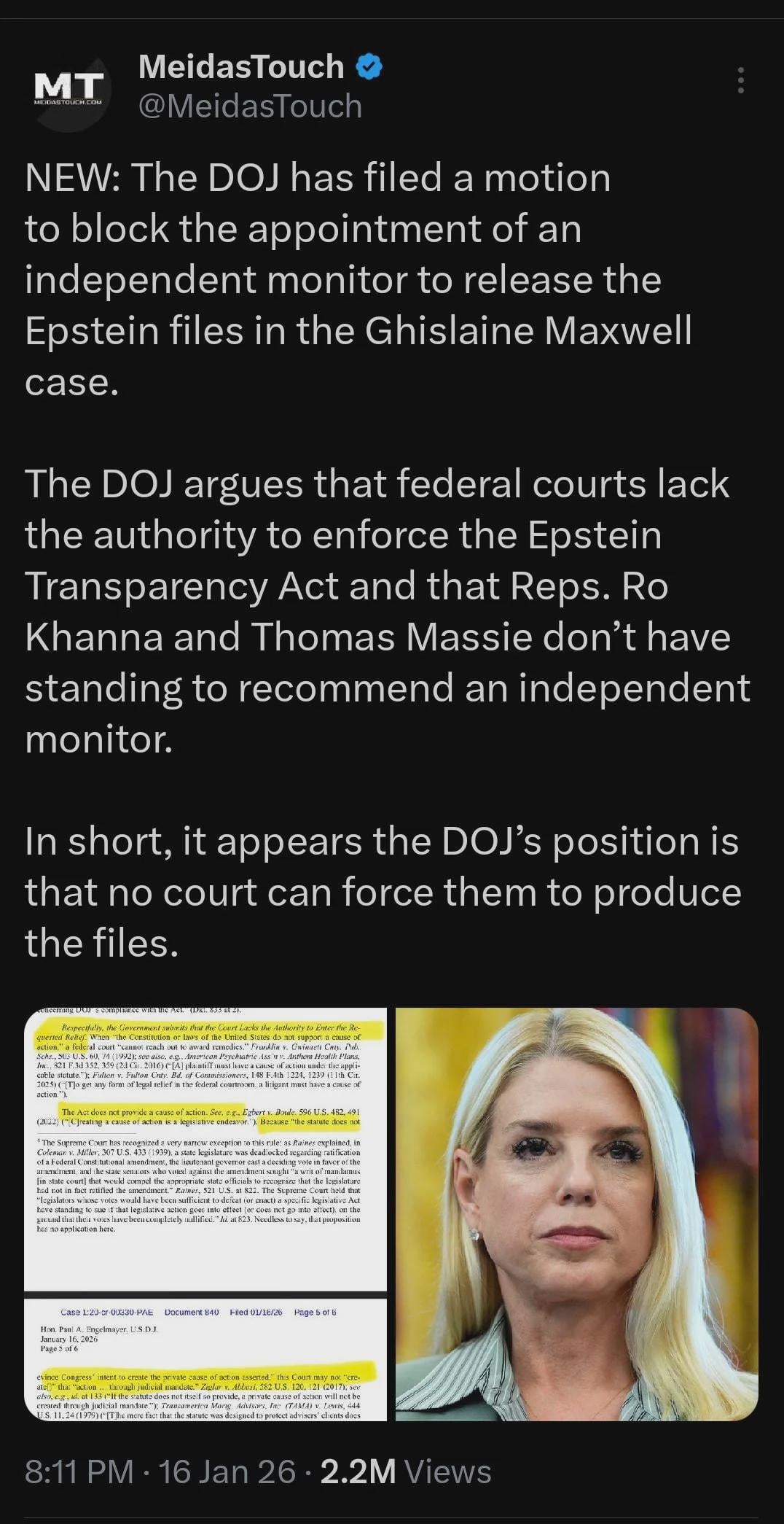 The DOJ filed a motion (link in the comments) to suppress having an independent monitor release the files from Ghislane Maxwell's case.The DOJ filed a motion (link in the comments) to suppress having an independent monitor release the files from Ghislane Maxwell's case.0 Commenti 0 condivisioni 110K Views 0 Anteprima