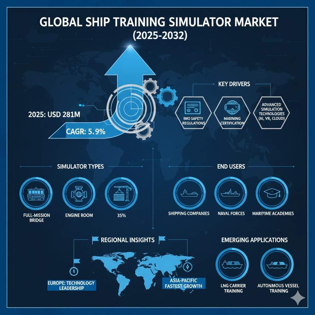 global Ship Training Simulator market is projected to grow from USD 281 million in 2024 to USD 409 million by 2032, registering a CAGR of 5.9%. Growth is driven by stricter IMO-STCW training requirements, rising global shipping activity, and rapid adoption of high-fidelity simulation technologies such as AI, VR, and cloud-based training platforms to enhance maritime safety and operational efficiency.Global Ship Training Simulator Market Outlook (2025–2032): 5.9% CAGR Driven by Maritime Safety Regulations & Advanced Simulation Technologies global Ship Training Simulator market is projected to grow from USD 281 million in 2024 to USD 409 million by 2032, registering a CAGR of 5.9%. Growth is driven by stricter IMO-STCW training requirements, rising global shipping activity, and rapid adoption of high-fidelity simulation technologies such as AI, VR, and cloud-based training platforms to enhance maritime safety and operational efficiency.0 Comments ·0 Shares ·29 Views ·0 Reviews