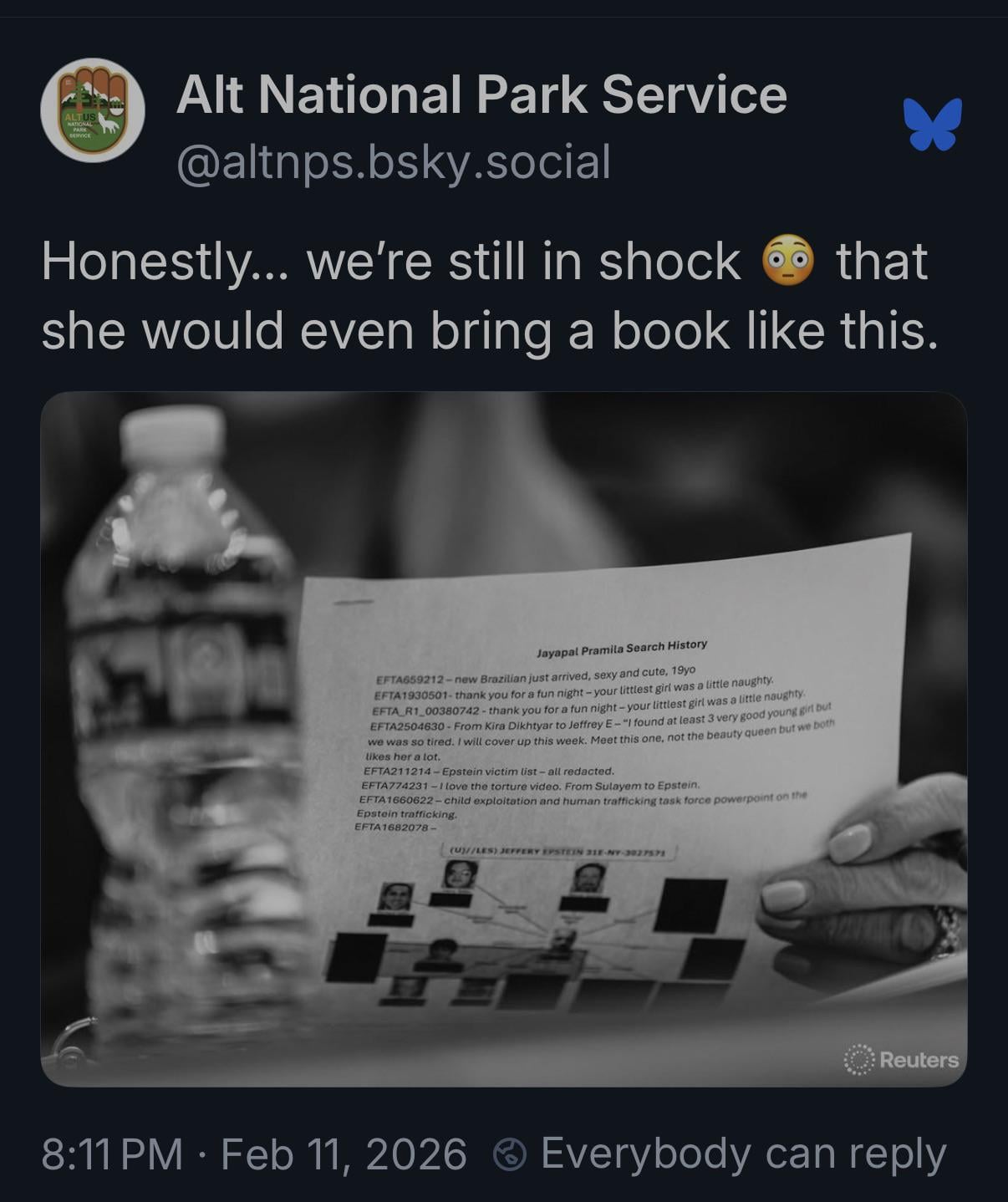 Blow up the image in Bondi’s hand at her congressional hearing to read Congresswoman Pramila’s search history during a recent “unredacted” peak of the Epstein files. Every victim should be interviewed by DOJ (hasn’t even been started!) and every predator should be investigated and prosecuted.Blow up the image in Bondi’s hand at her congressional hearing to read Congresswoman Pramila’s search history during a recent “unredacted” peak of the Epstein files. Every victim should be interviewed by DOJ (hasn’t even been started!) and every predator should be investigated and prosecuted.0 Commentarii 0 Distribuiri 35K Views 0 previzualizare