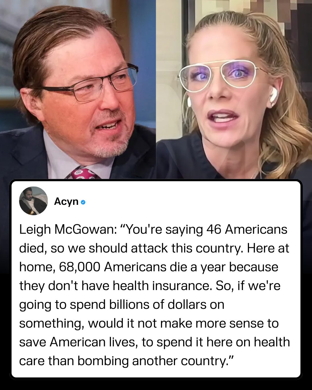 During the segment, McGowan challenged the push for military retaliation after the deaths of dozens of Americans, arguing that the U.S. government routinely spends billions on wars overseas while tens of thousands of Americans die each year due to lack of health insurance.Political commentator Leigh McGowan sparked a heated debate during a recent appearance on CNN debating the escalating conflict with Iran. During the segment, McGowan challenged the push for military retaliation after the deaths of dozens of Americans, arguing that the U.S. government routinely spends billions on wars overseas while tens of thousands of Americans die each year due to lack of health insurance.0 Comments 0 Shares 57 Views 0 Reviews