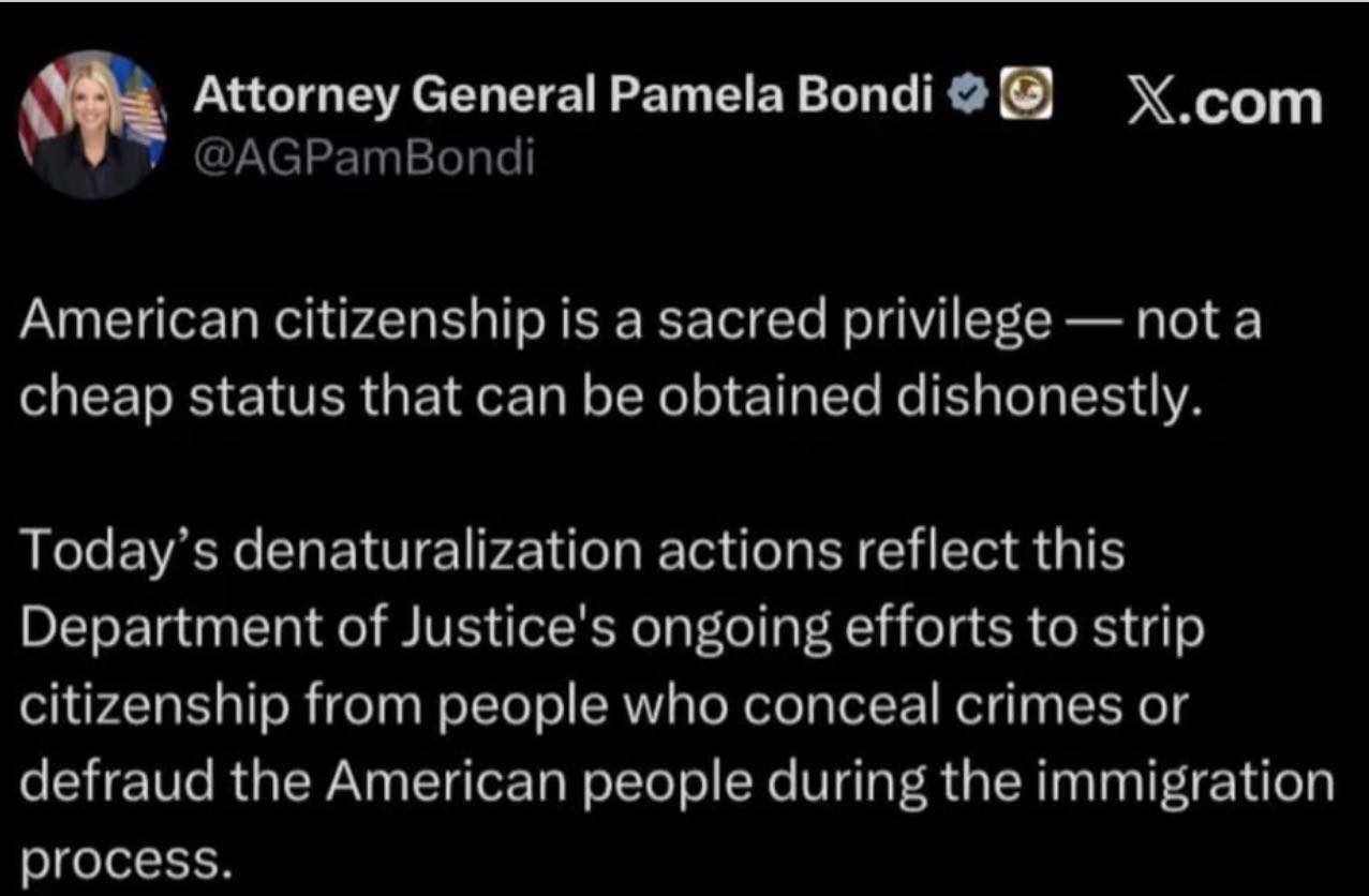 Bộ trưởng Tư pháp Pam Bondi nói" Quốc tịch Mỹ là một đặc quyền thiêng liêng, không phải thứ có thể đạt được bằng gian dối.” Vì thế Chính phủ Mỹ sẽ tiếp tục tước quốc tịch những người che giấu tội phạm hoặc lừa dối trong quá trình nhập cưLấy được quốc tịch Mỹ bằng gian dối… thì cũng có thể bị lấy lại. Bộ Tư pháp dưới thời TT Trump vừa thông báo tước quốc tịch (denaturalization) của 2 người nước ngoài vì gian lận trong hồ sơ nhập tịch. Bộ trưởng Tư pháp Pam Bondi nói" Quốc tịch Mỹ là một đặc quyền thiêng liêng, không phải thứ có thể đạt được bằng gian dối.” Vì thế Chính phủ Mỹ sẽ tiếp tục tước quốc tịch những người che giấu tội phạm hoặc lừa dối trong quá trình nhập cư0 Commentarii 0 Distribuiri 151 Views 0 previzualizare