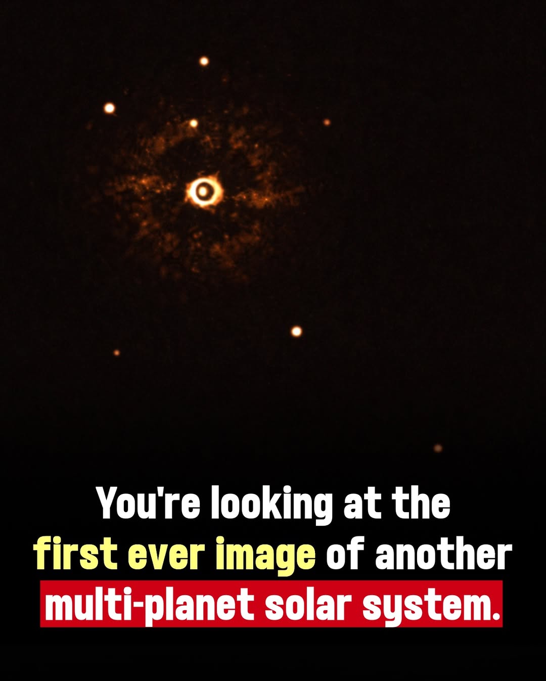 You’re looking at a historic breakthrough — one of the first direct images of a multi-planet system around the star HR 8799, about 129 light-years away in the constellation Pegasus. Those glowing dots aren’t stars — they’re actual planets orbiting another sun