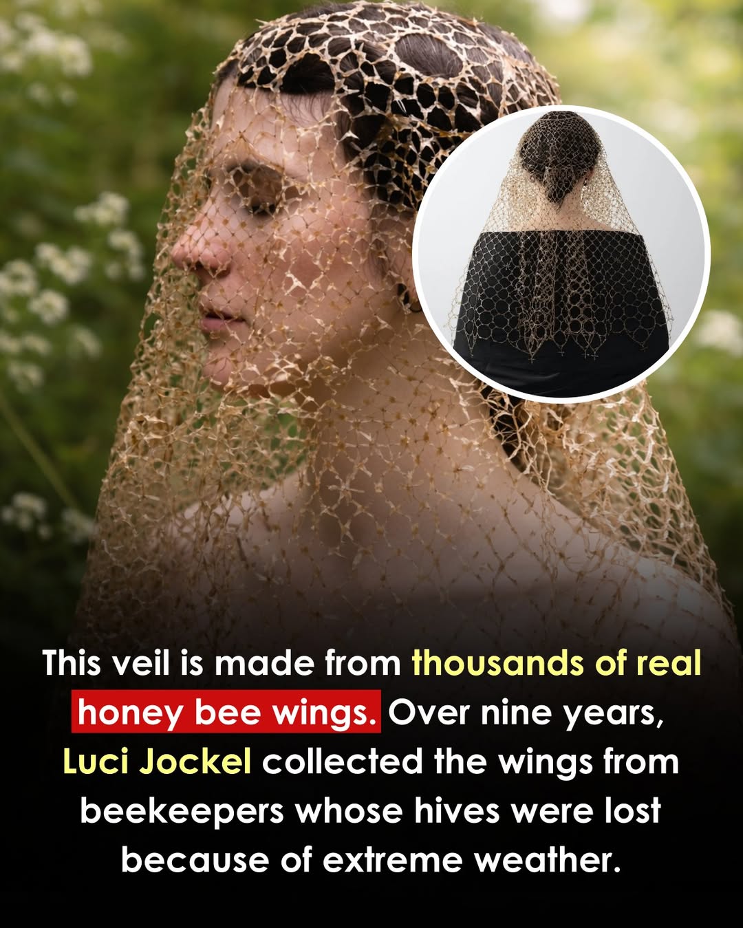Luci Jockel created a stunning piece called the Gold Veil using thousands of real honey bee wings . Each wing was carefully glued by hand, using only wings from bees that had already passed away — never harming any bees in the process.