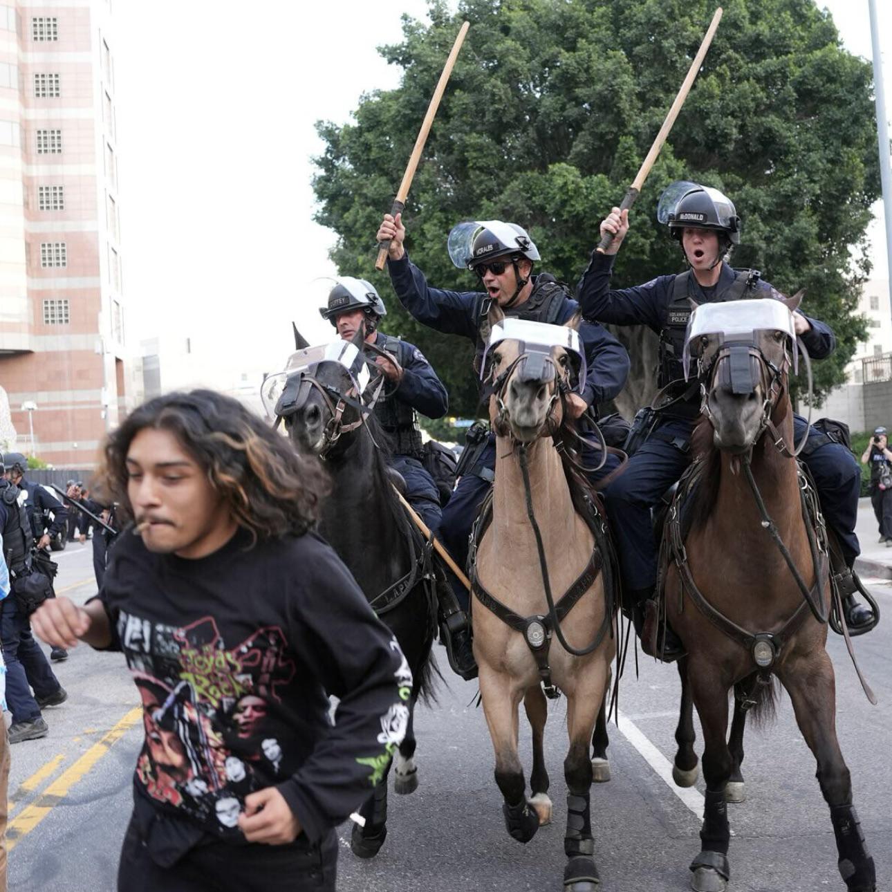A man is chased by LAPD officers on horseback on Temple Street after "No Kings" protest on Saturday. (Scott Strazzante/For The Times)A man is chased by LAPD officers on horseback on Temple Street after "No Kings" protest on Saturday. (Scott Strazzante/For The Times)0 Comments 0 Shares 148K Views 0 Reviews