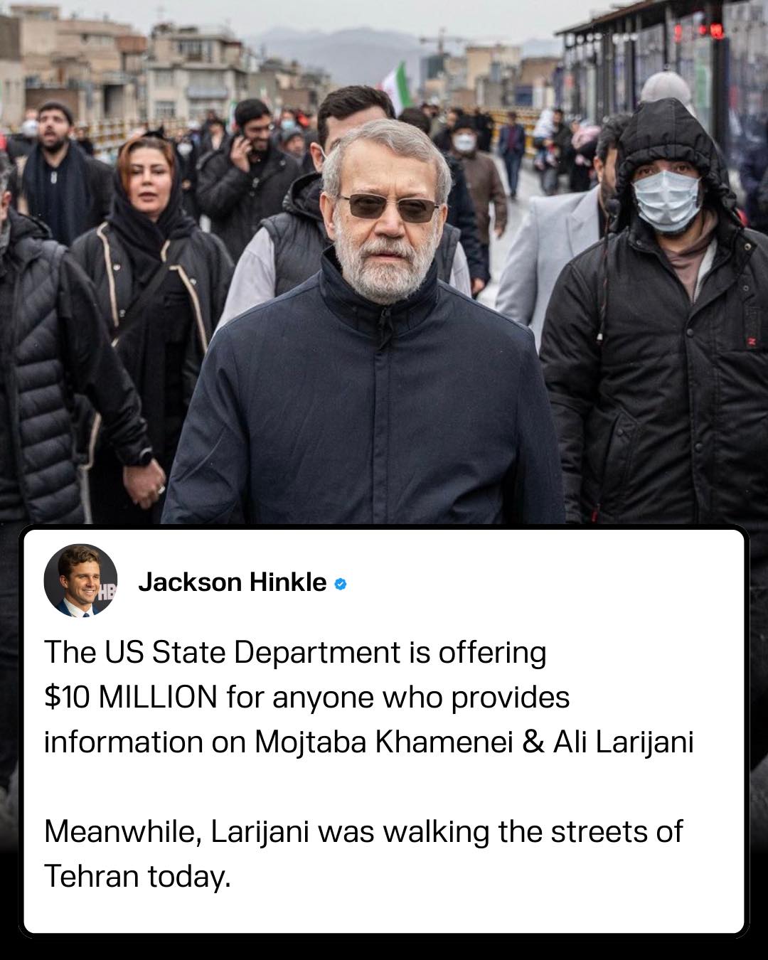 The U.S. announced a bounty of $10 million for anyone who has information on Mojtaba Khamenei and top security official Ali Larijani today, and meanwhile Larijani was walking around the streets of Theran.The U.S. announced a bounty of $10 million for anyone who has information on Mojtaba Khamenei and top security official Ali Larijani today, and meanwhile Larijani was walking around the streets of Theran.0 Comentários 0 Compartilhamentos 38 Visualizações 0 Anterior