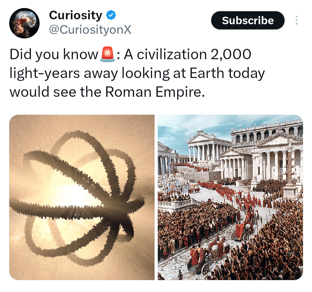 A civilization 2,000 light-years away looking at Earth today would see the Roman Empire.A civilization 2,000 light-years away looking at Earth today would see the Roman Empire.0 Comments 0 Shares 82K Views 0 Reviews