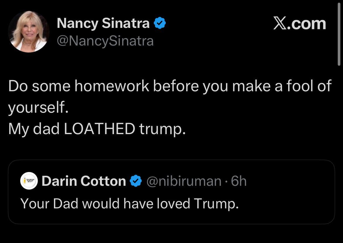 Nancy Sinatra responds to false claim about her dad “My dad LOATHED trump.”