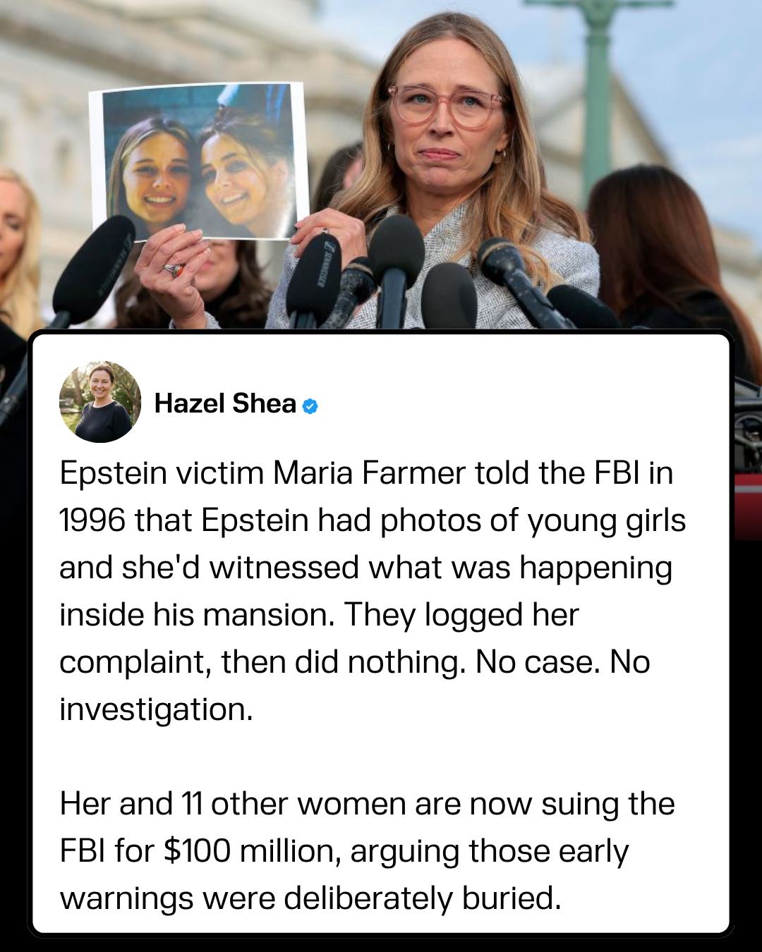 The complaint was real. The questions around why it was never pursued remain unanswered.Epstein victim Maria Farmer reported to the FBI in 1996 that Epstein had photos of young girls and she had witnessed what was happening inside his mansion. The FBI logged her complaint on September 3rd, 1996. No case was opened. No investigation followed. For nearly 30 years, the file was assumed lost. In 2025, it resurfaced under the Epstein Files Transparency Act. Nine years after her warning, investigators uncovered dozens of victims. Now Maria and 11 other women are suing the FBI for $100 million. They argue those early warnings were not acted upon and that the failure to investigate allowed the abuse to continue. The complaint was real. The questions around why it was never pursued remain unanswered.0 Comments 0 Shares 79 Views 0 Reviews