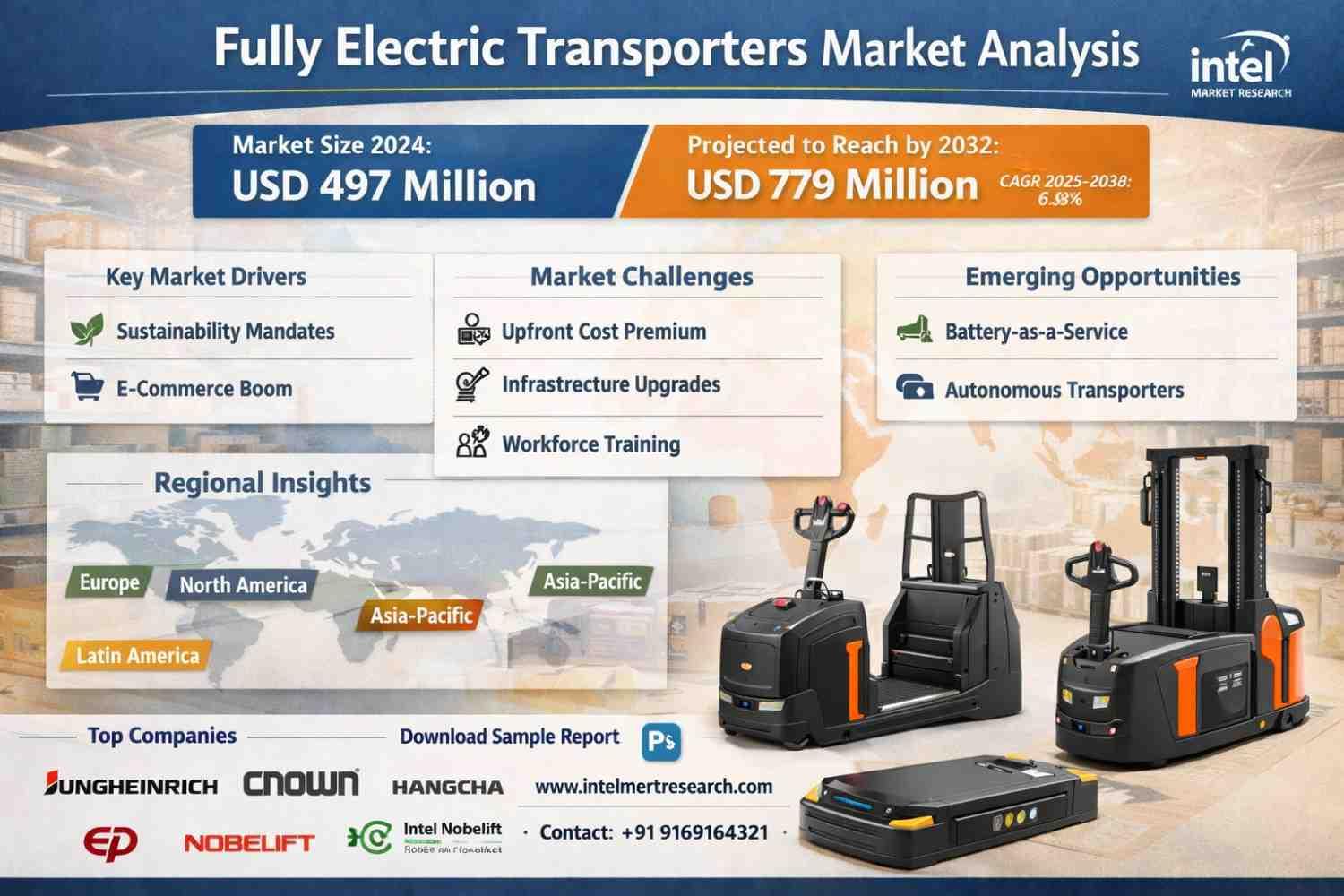 global Fully Electric Transporter market was valued at USD 497 million in 2024 and is projected to reach USD 779 million by 2032, growing at a CAGR of 6.8% during the forecast period (2025–2032). This growth is fueled by increasing warehouse automation, tightening emission regulations, and rising demand for energy-efficient material handling solutions.global Fully Electric Transporter market |CAGR of 6.8% global Fully Electric Transporter market was valued at USD 497 million in 2024 and is projected to reach USD 779 million by 2032, growing at a CAGR of 6.8% during the forecast period (2025–2032). This growth is fueled by increasing warehouse automation, tightening emission regulations, and rising demand for energy-efficient material handling solutions.0 Comments ·0 Shares ·2 Views ·0 Reviews -