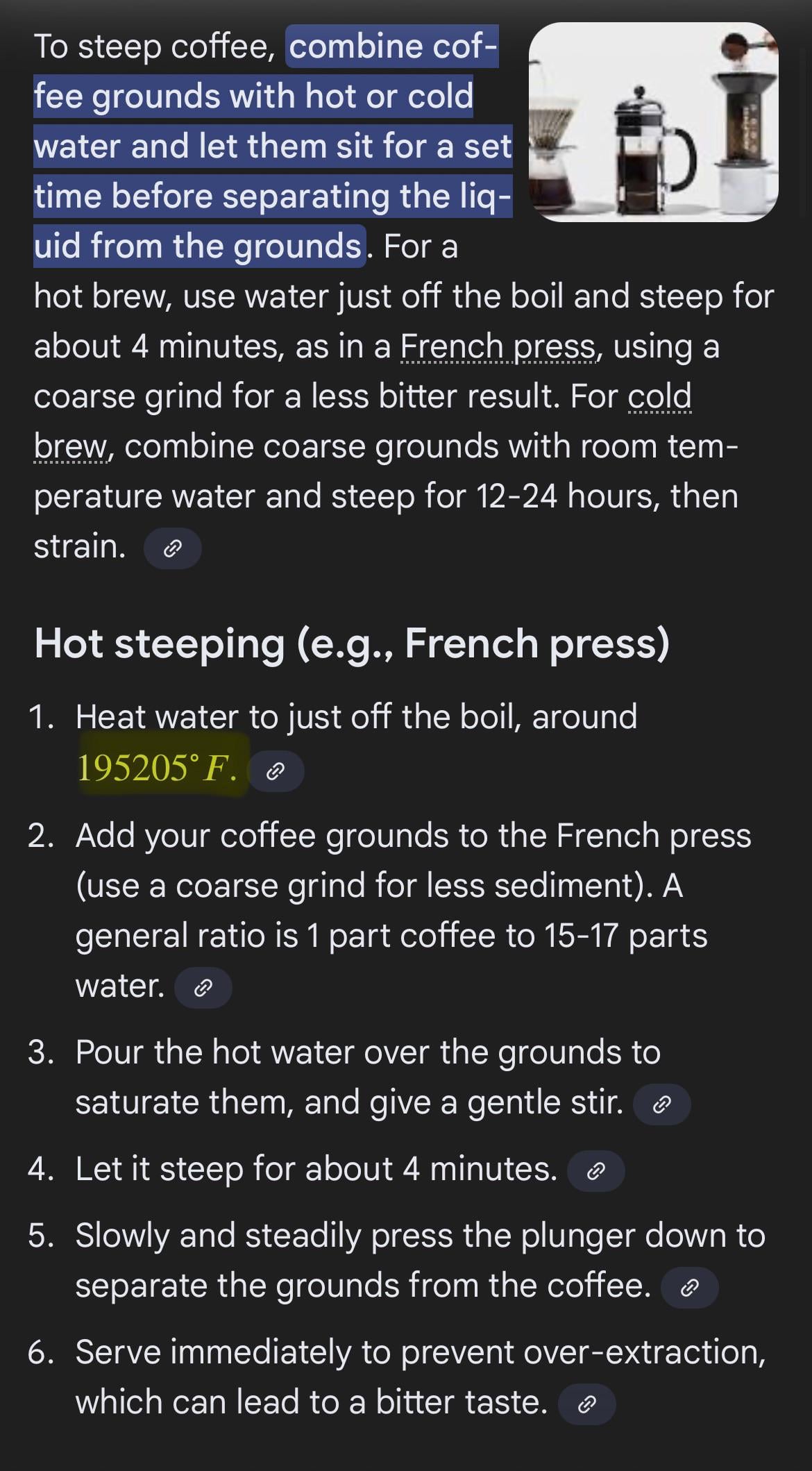 I Googled “How to steep coffee grounds” and Google told me to boil water hotter than the sun.