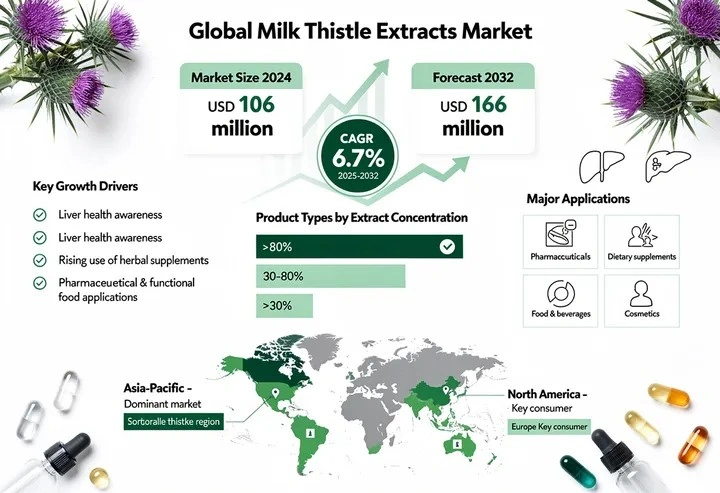 global Milk Thistle Extracts market was valued at USD 106 million in 2024 and is projected to reach USD 166 million by 2032, expanding at a CAGR of 6.7% during the forecast period (2025–2032). Market growth is supported by rising awareness of natural liver health supplements, increasing preference for herbal and plant-based remedies, and expanding applications across pharmaceuticals, dietary supplements, functional foods, and cosmetics. Ongoing clinical research validating the hepatoprotective benefits of silymarin further strengthens long-term demand.Global Milk Thistle Extracts Market to Grow at 6.7% CAGR Through 2032 global Milk Thistle Extracts market was valued at USD 106 million in 2024 and is projected to reach USD 166 million by 2032, expanding at a CAGR of 6.7% during the forecast period (2025–2032). Market growth is supported by rising awareness of natural liver health supplements, increasing preference for herbal and plant-based remedies, and expanding applications across pharmaceuticals, dietary supplements, functional foods, and cosmetics. Ongoing clinical research validating the hepatoprotective benefits of silymarin further strengthens long-term demand.0 Yorumlar ·0 hisse senetleri ·5 Views ·0 önizleme