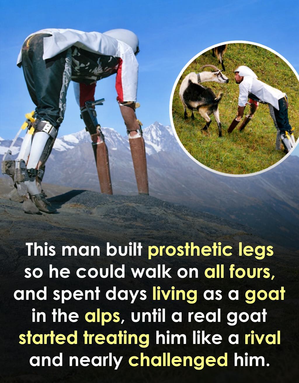 In 2016, the British designer built prosthetic limbs to walk on all fours and even used a special device to digest grass. He then traveled to the Alps and lived among real goats, grazing and climbing with the herd.
