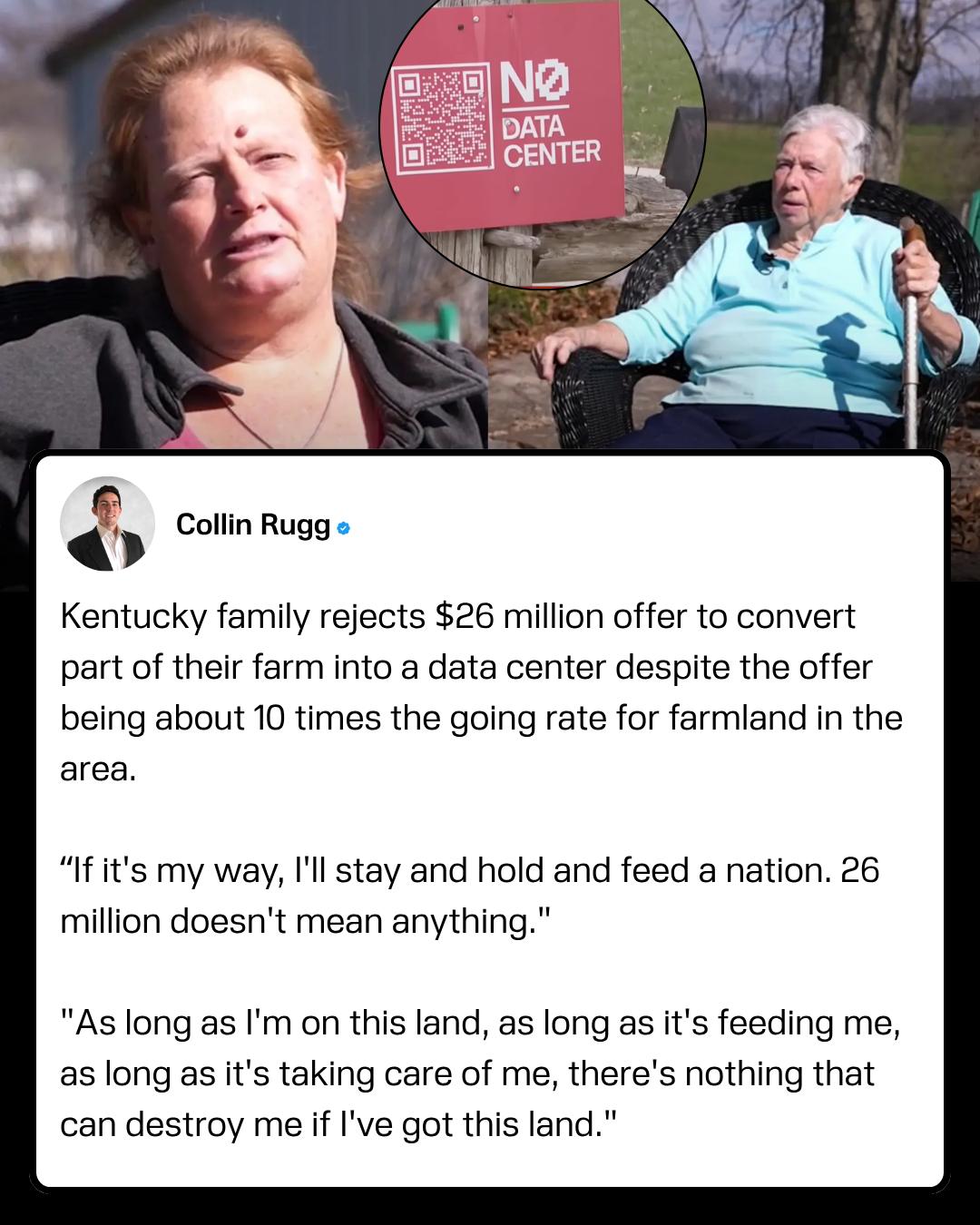In Mason County, Kentucky, 82-year-old farmer Ida Huddleston and her daughter Delsia Bare have turned down a combined $26 million offer from a developer linked to a major tech company that wants to build a massive data center on their land.