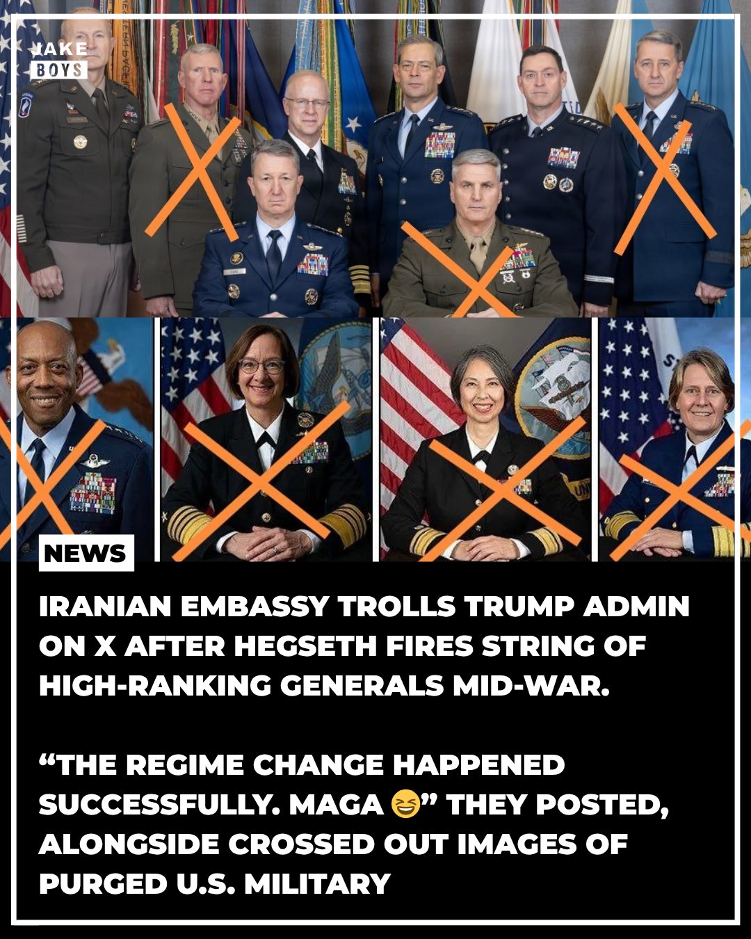 The exchange underscores how geopolitical tensions are now playing out not just on the ground, but in real time on social media — with foreign governments seizing on internal U.S. decisions to shape narratives and score political points.Iran’s official embassy account is drawing attention after mocking the Trump administration online, posting “The regime change happened successfully. MAGA ” alongside images referencing the removal of senior U.S. military figures. The post comes amid reports that Defense Secretary Pete Hegseth has dismissed multiple high-ranking generals during an active conflict, a move that has sparked concern among critics about military continuity and leadership stability. The exchange underscores how geopolitical tensions are now playing out not just on the ground, but in real time on social media — with foreign governments seizing on internal U.S. decisions to shape narratives and score political points.0 Commenti 0 condivisioni 24 Views 0 Anteprima