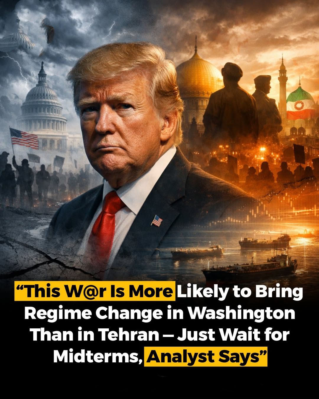 • “This war is more likely to bring regime change in Washington than in Tehran — just wait for the midterms,” an analyst reportedly claims, pointing to potential political fallout in the United States rather than Iran.