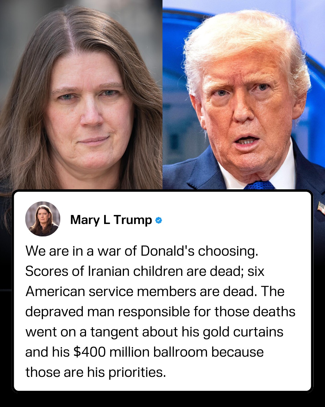 • Mary Trump has taken a swing at her uncle, President Donald Trump, in her latest remarks on X. Stating that "we're in a war of Donald's choosing."