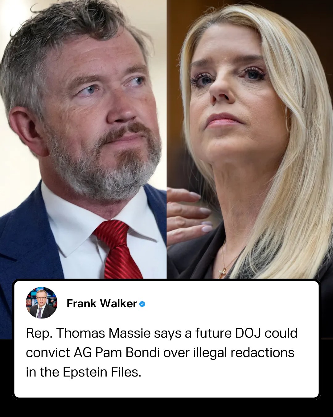 Thomas Massie said a future Department of Justice could potentially pursue charges against Attorney General Pam Bondi if redactions made in documents related to Jeffrey Epstein were found to be unlawful.