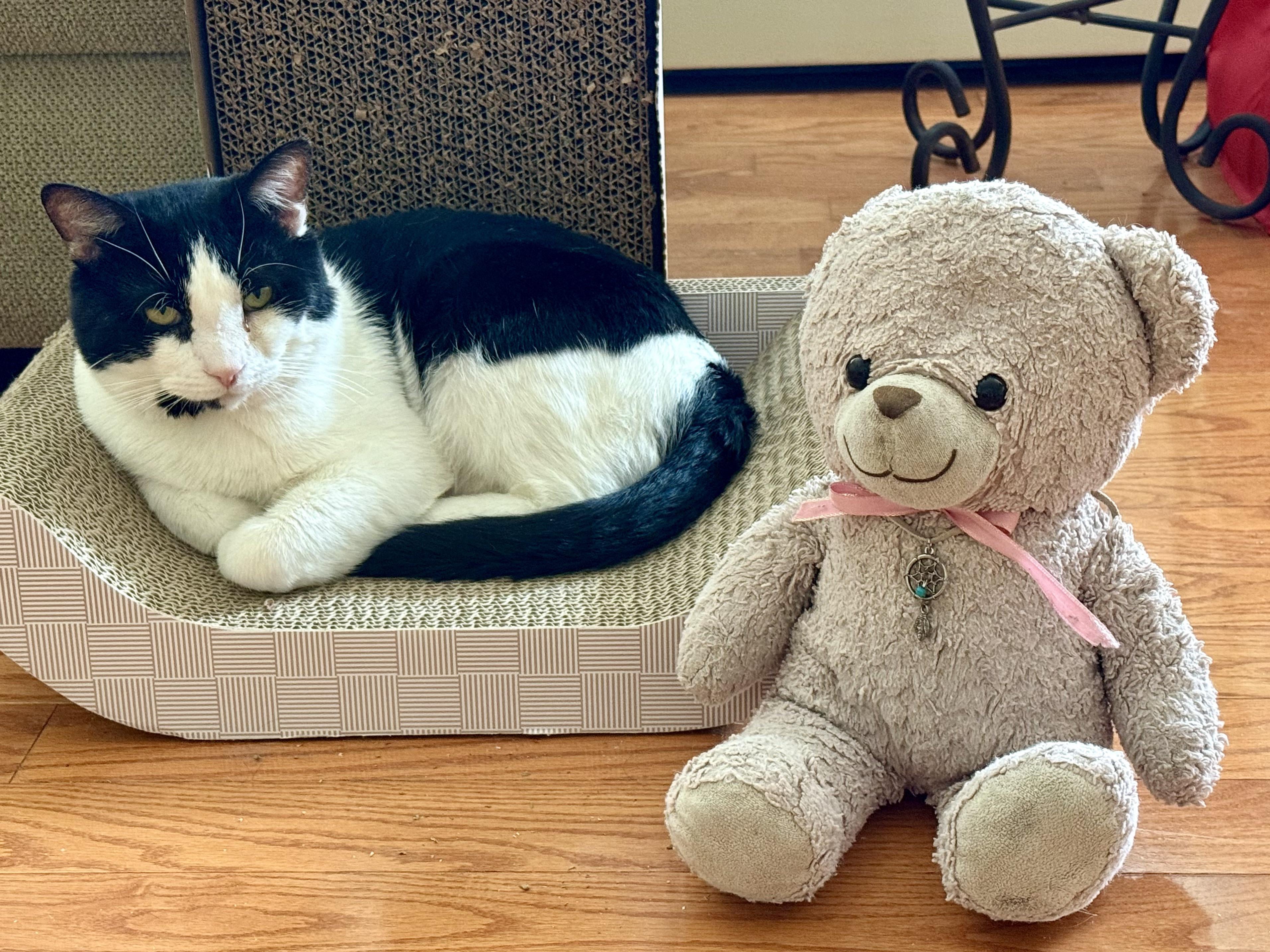 My kitty named Miracle and my stuffed animal named Mom Bear 🧸