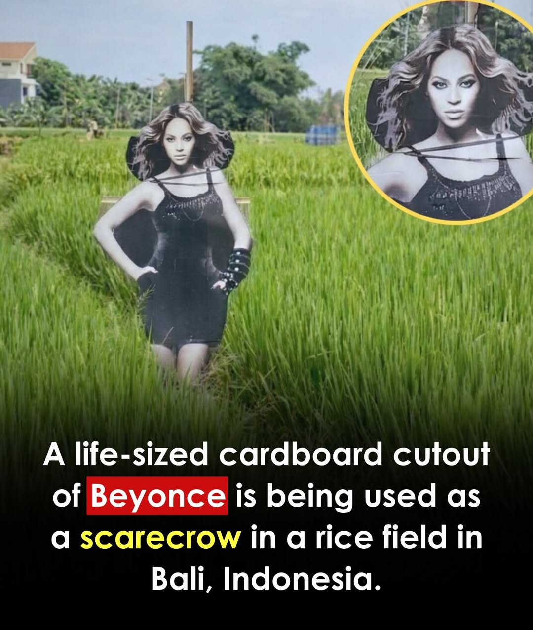 A quirky farming trick went viral after locals used a life-size cutout of Beyoncé as a scarecrow in a rice field. The unusual sight, spotted in Denpasar, quickly caught attention online when a passerby shared a video Farmers said the celebrity standee actually worked, helping scare off crows that damage crops. What started as a simple farming hack turned into a global viral moment — proving even agriculture can have star power