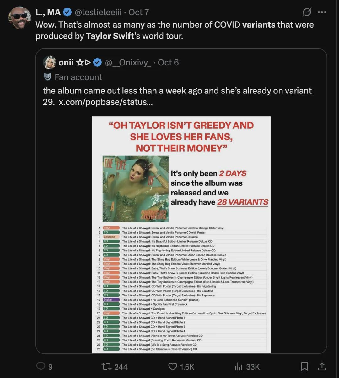 Taylor Swift has now released nearly 30 variants and 1 film for The Life of a Showgirl. Each variant offers something different. If your kid wants each offering you have to purchase each variant. It would cost you $1,080. This is parasocial abuse.