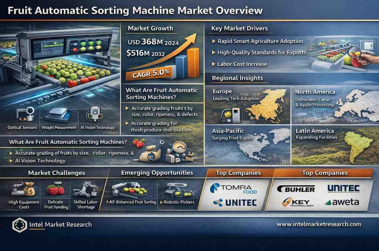 global Fruit Automatic Sorting Machine market was valued at USD 368 million in 2024 and is projected to reach USD 516 million by 2032, growing at a steady CAGR of 5.0% during the forecast period (2025–2032). This growth is driven by increasing automation demands in food processing, rising labor costs, and stringent quality control requirements in fresh produce distribution.
