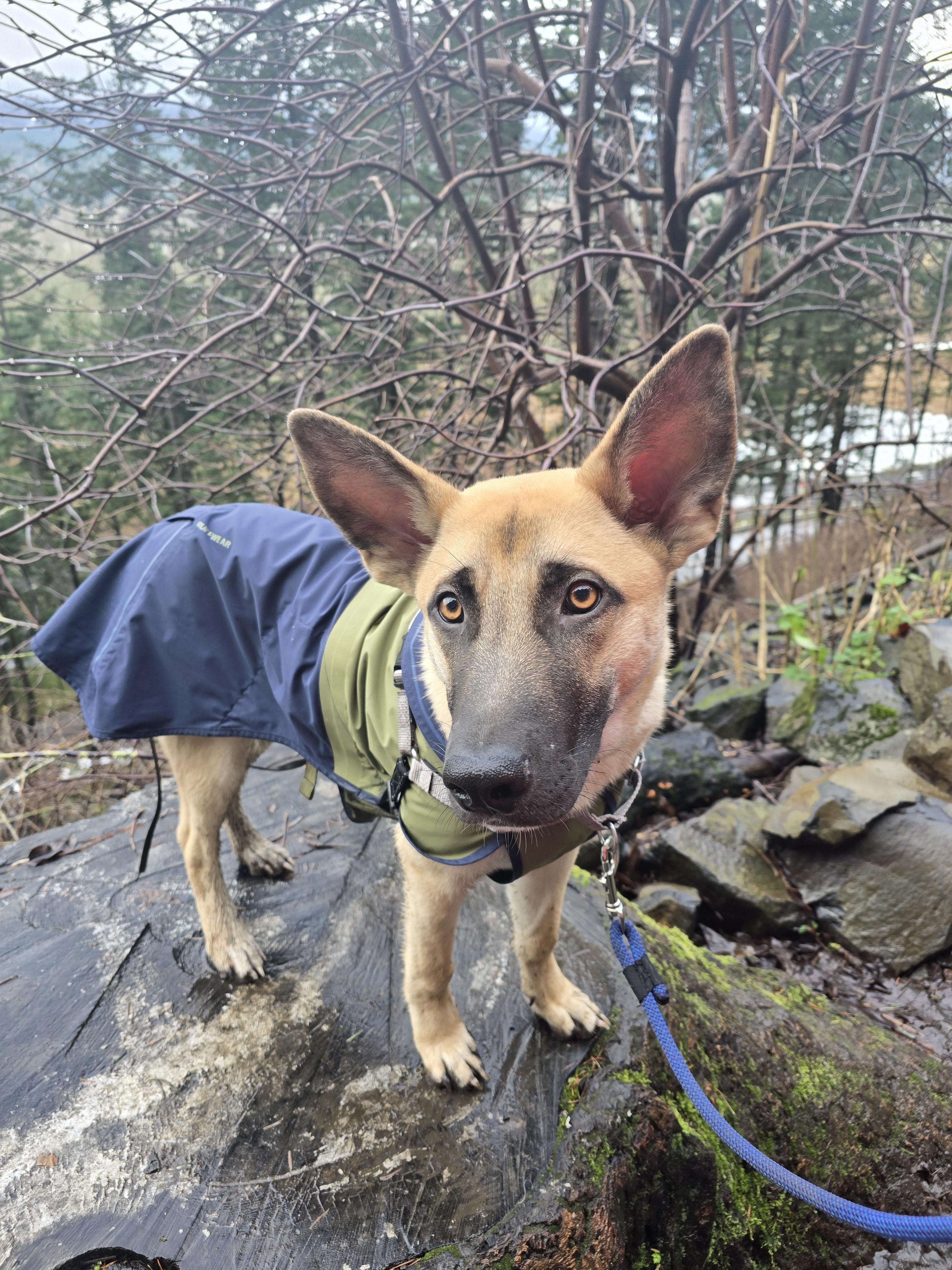 Our adventure buddy likes to jump on stumps when we go hiking
