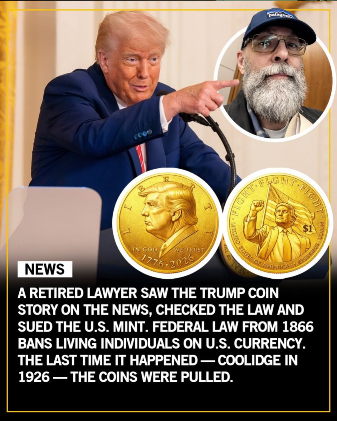 • A retired lawyer in Portland, Oregon, has filed a federal lawsuit challenging a proposed U.S. Mint coin design. James Rickher, 56, says he took legal action after reports emerged about a 24-karat gold commemorative coin featuring Donald Trump, planned as part of celebrations for America’s 250th anniversary in 2026.