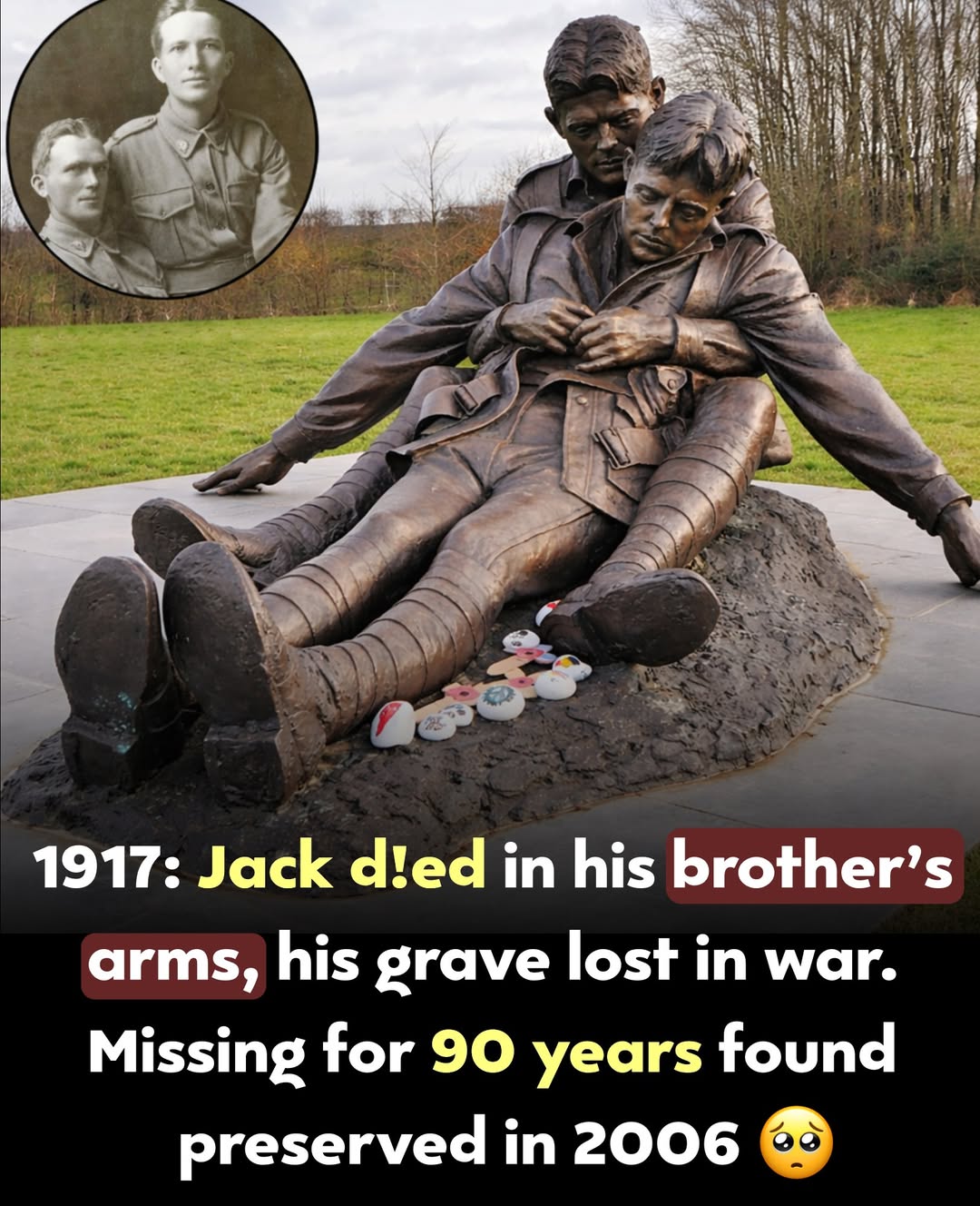 The 90-Year Promise: The Brothers in Arms Memorial Brothers John “Jack” Hunter and James “Jim” Hunter from Queensland enlisted side by side, bound by a promise to protect each other through the horrors of war. Their story became one of loyalty, sacrifice, and an unbreakable bond forged on the battlefield. Decades later, archaeologists discovered Jack’s remains near Polygon Wood. Through DNA testing with his niece, Mollie Millis, his identity was finally confirmed, ending nearly 90 years of uncertainty for the family. In a haunting moment, when his remains were uncovered, sunlight briefly revealed traces of the original blue color in his eyes before it faded away. Today, a powerful life-sized bronze sculpture by Louis Laumen captures Jim holding his dying brother in the trenches, preserving their final moments forever. The memorial park also features a monolith engraved with lyrics from Mark Knopfler’s *“Brothers in Arms,”* honoring their sacrifice and the enduring promise between them.