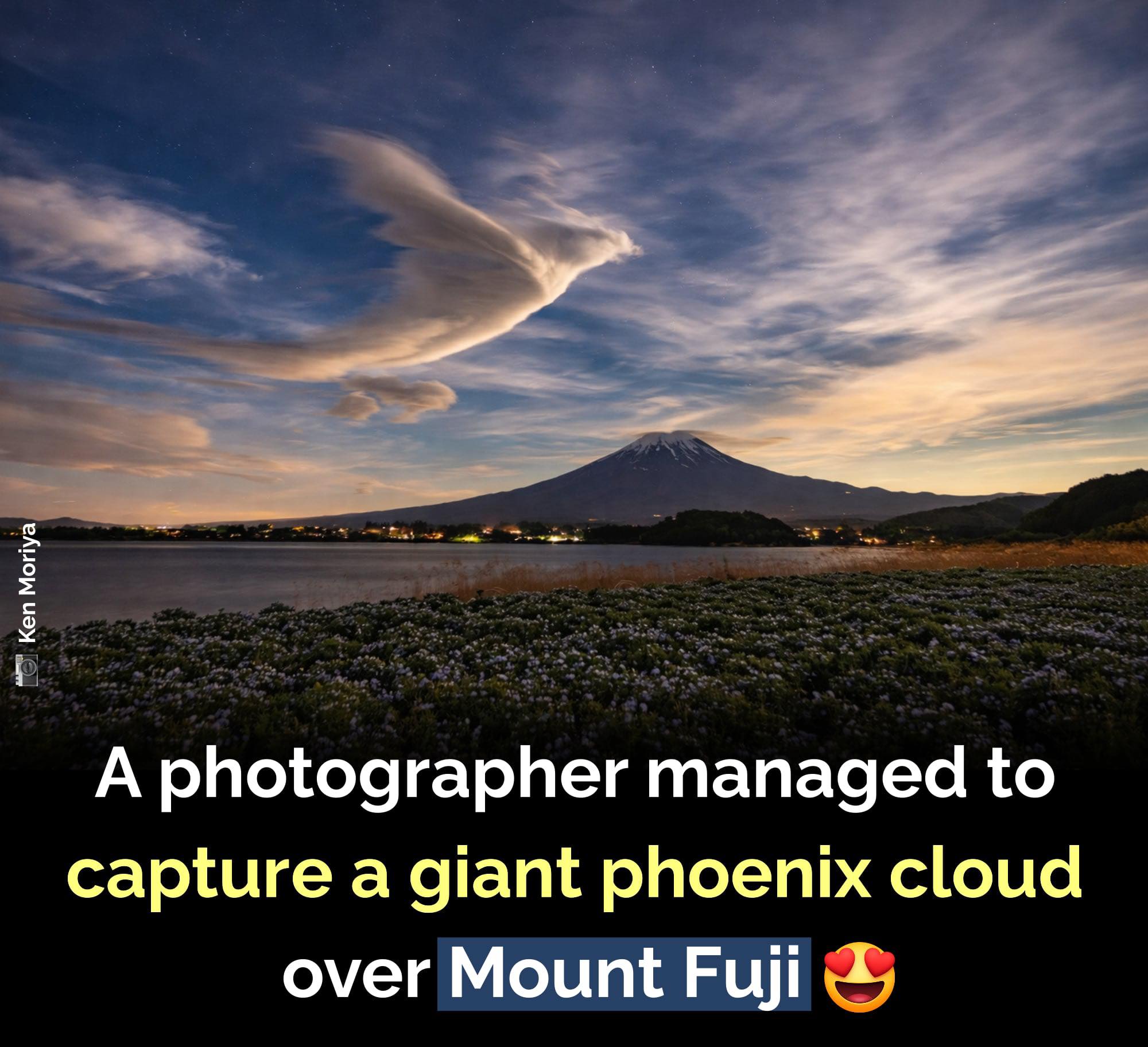 A simple look at the sky above Mount Fuji turned into an unforgettable sight. As the sun slowly set, a huge cloud formed over the mountain’s peak, taking on the striking shape of a phoenix with its wings spread wide. It looked less like an ordinary cloud and more like a mythical creature rising into the sky. The incredible moment was captured by photographer Ken Moriya, who is known for chasing Japan’s most dramatic skies. In his photograph, the glowing cloud hovered perfectly above Mount Fuji, as if nature had carefully painted the scene. For a brief moment, sunlight, wind, and clouds came together to create something truly magical. But just as quickly as it appeared, the cloud began to fade away. That is the beauty of nature’s rare moments. They cannot be planned or recreated. They happen for only a few seconds, rewarding those lucky enough to witness them. Once again, Mount Fuji reminded everyone why it has inspired artists, dreamers, and storytellers for centuries. When nature puts on a show, the result can feel almost unreal.